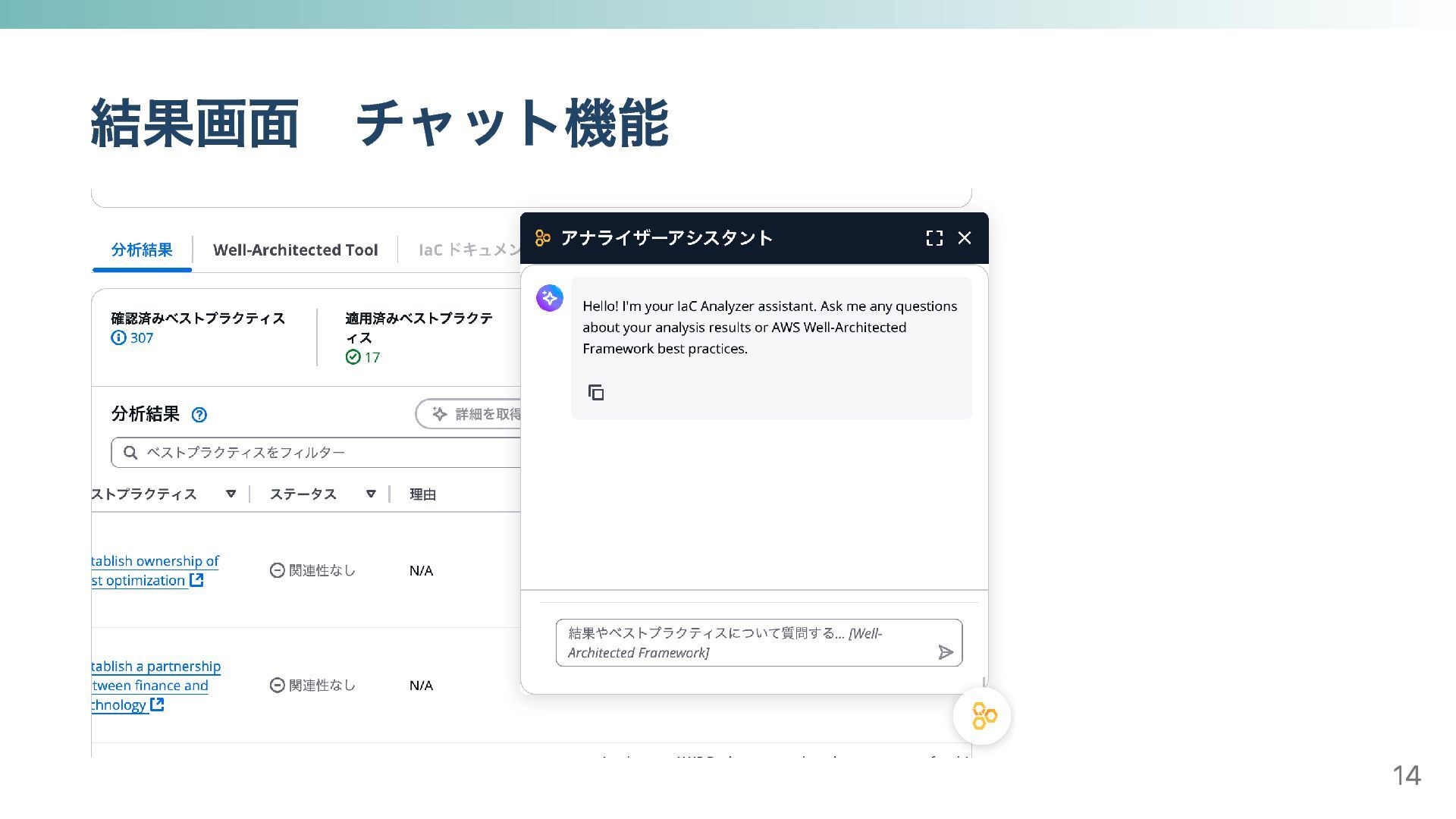 まとめ Well-Architected IaC AnalyzerはIaCコードの品質向上に役立つツール CopilotとWell-Architected IaC Analyzerで役割や強みが異なる 日常使いはCopilot,定期的なレビューにはWell-Architected IaC Analyzer