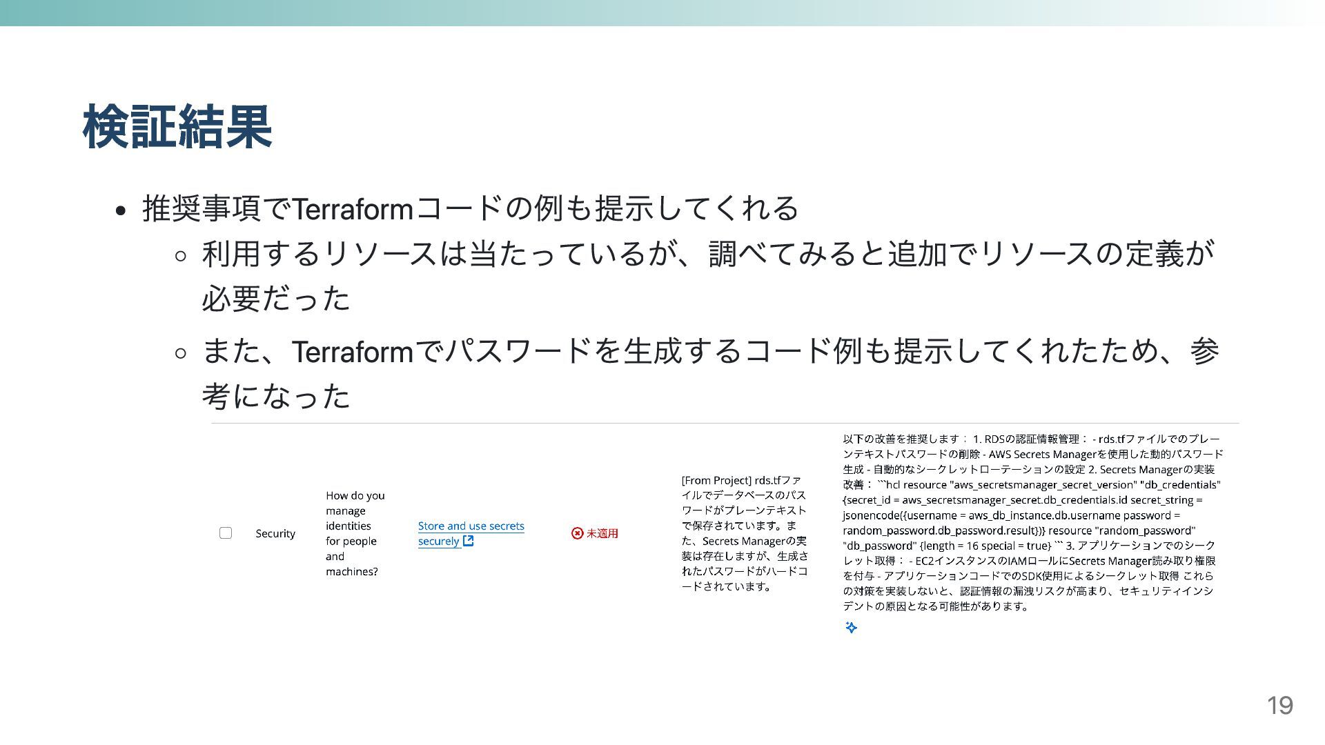 検証結果 推奨事項でTerraformコードの例も提示してくれる 利用するリソースは当たっているが、調べてみると追加でリソースの定義が 必要だった また、Terraformでパスワードを生成するコード例も提示してくれたため、参 考になった 19