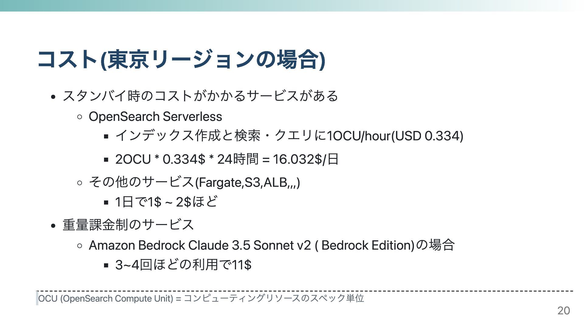 24時間 = 16.032$/日 その他のサービス(Fargate,S3,ALB,,,) 1日で1$ ~ 2$ほど 重量課金制のサービス Amazon Bedrock Claude 3.5 Sonnet v2 ( Bedrock Edition)の場合 3~4回ほどの利用で11$ OCU (OpenSearch Compute Unit) = コンピューティングリソースのスペック単位 20