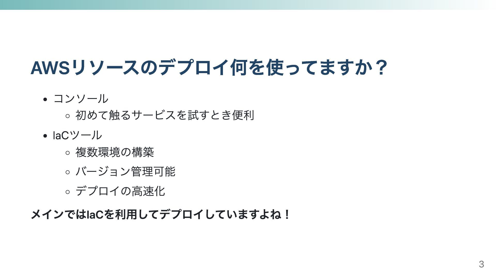 AWSリソースのデプロイ何を使ってますか? コンソール 初めて触るサービスを試すとき便利 IaCツール 複数環境の構築 バージョン管理可能 デプロイの高速化 メインではIaCを利用してデプロイしていますよね! 3