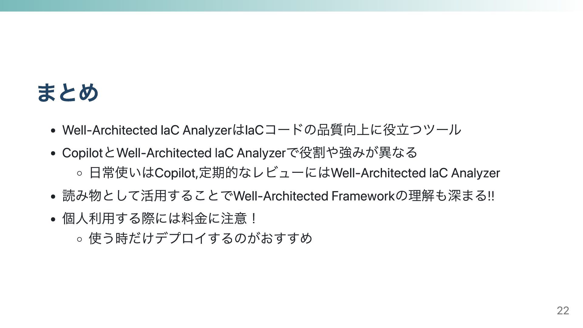 読み物として活用することでWell-Architected Frameworkの理解も深まる!! 個人利用する際には料金に注意! 使う時だけデプロイするのがおすすめ 22