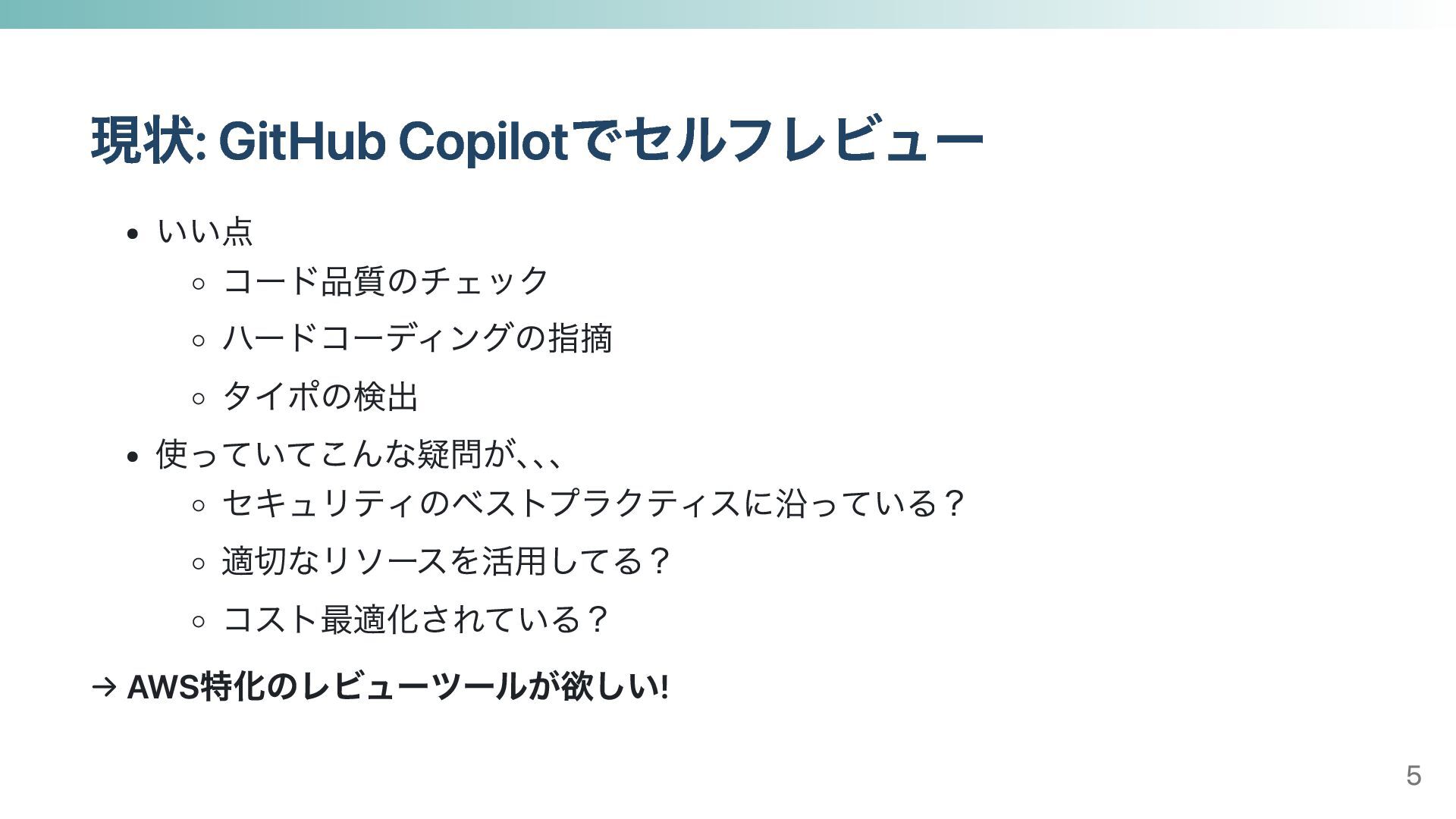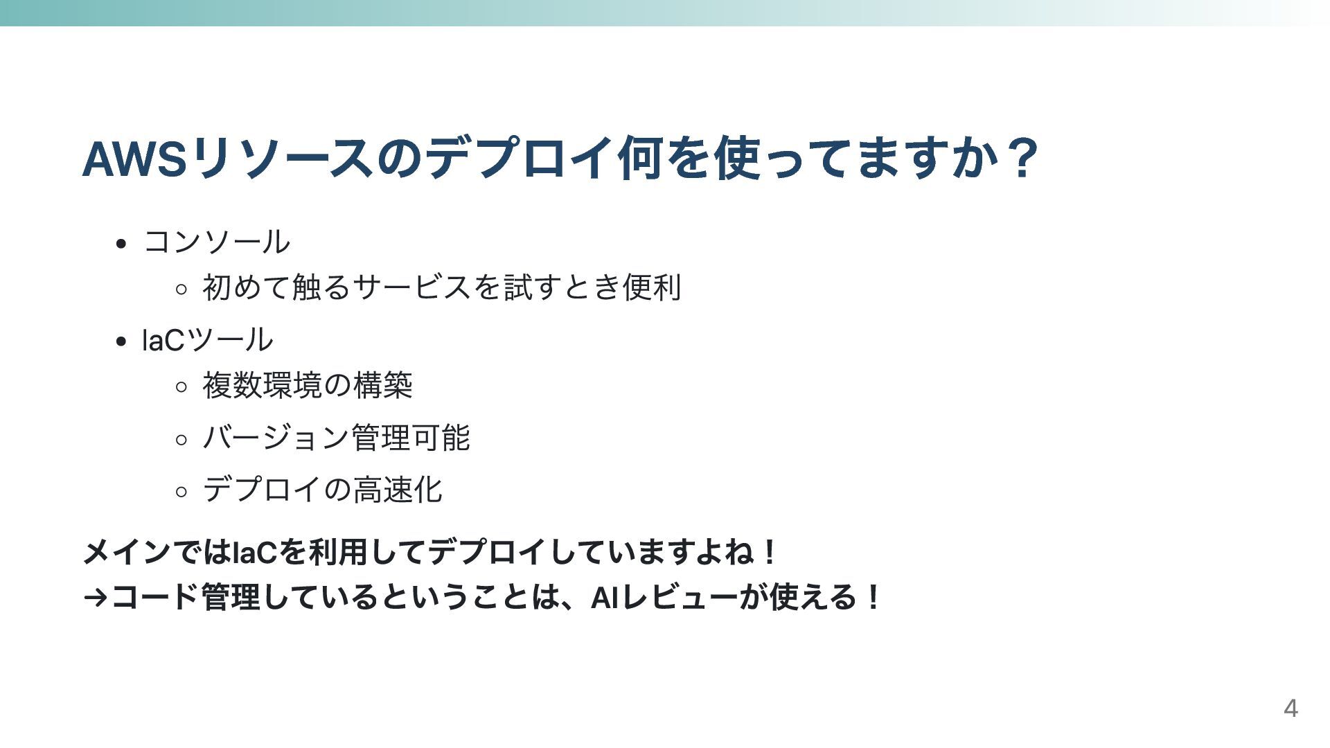 AWSリソースのデプロイ何を使ってますか? コンソール 初めて触るサービスを試すとき便利 IaCツール 複数環境の構築 バージョン管理可能 デプロイの高速化 メインではIaCを利用してデプロイしていますよね! →コード管理しているということは、AIレビューが使える! 4