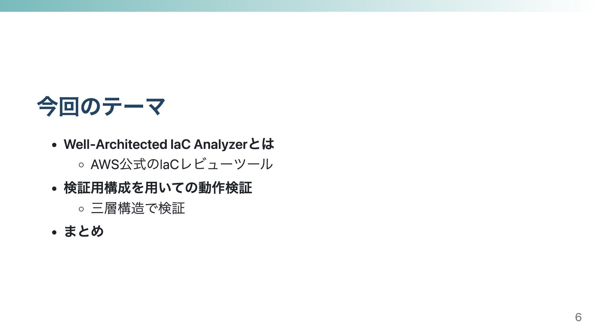 今回のテーマ Well-Architected IaC Analyzerとは AWS公式のIaCレビューツール 検証用構成を用いての動作検証 三層構造で検証 まとめ 6