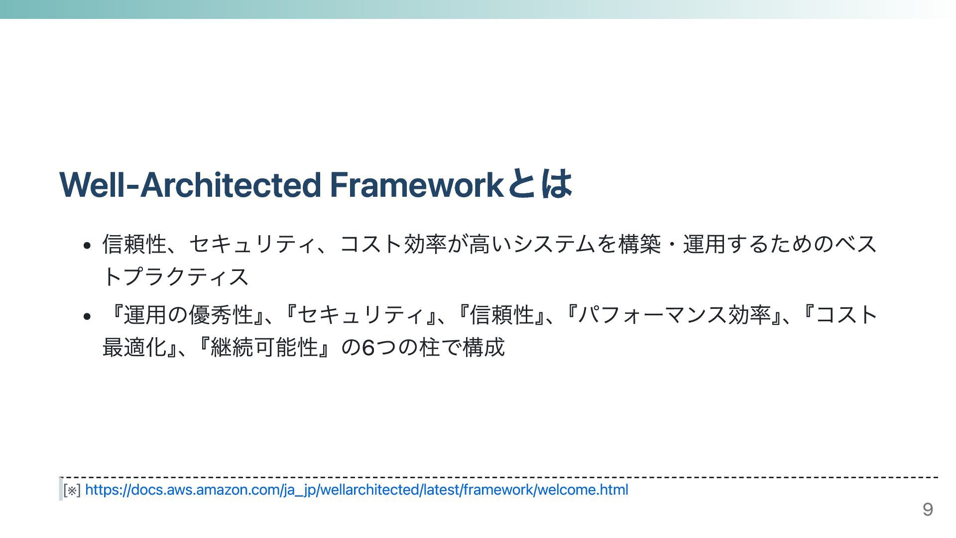 Well-Architected Frameworkとは 信頼性、セキュリティ、コスト効率が高いシステムを構築・運用するためのベス トプラクティス 『運用の優秀性』 、 『セキュリティ』 、 『信頼性』 、