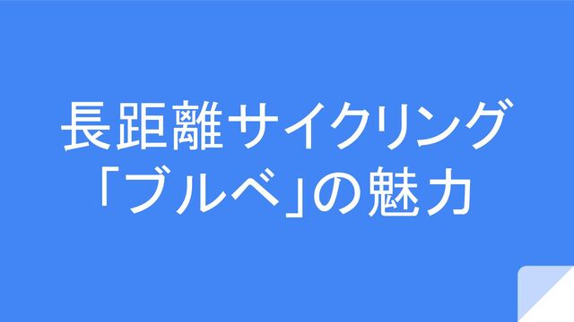 ブルベとは? • ノーサポート・自己責任の長距離サイクリングイベント • 参加者は事前に公表されているルートに従って走行する • 指定されたチェックポイントを時間内に通過しゴールを目指す • 制限時間はおおよそ平均時速15km程度 ※出典:Audax