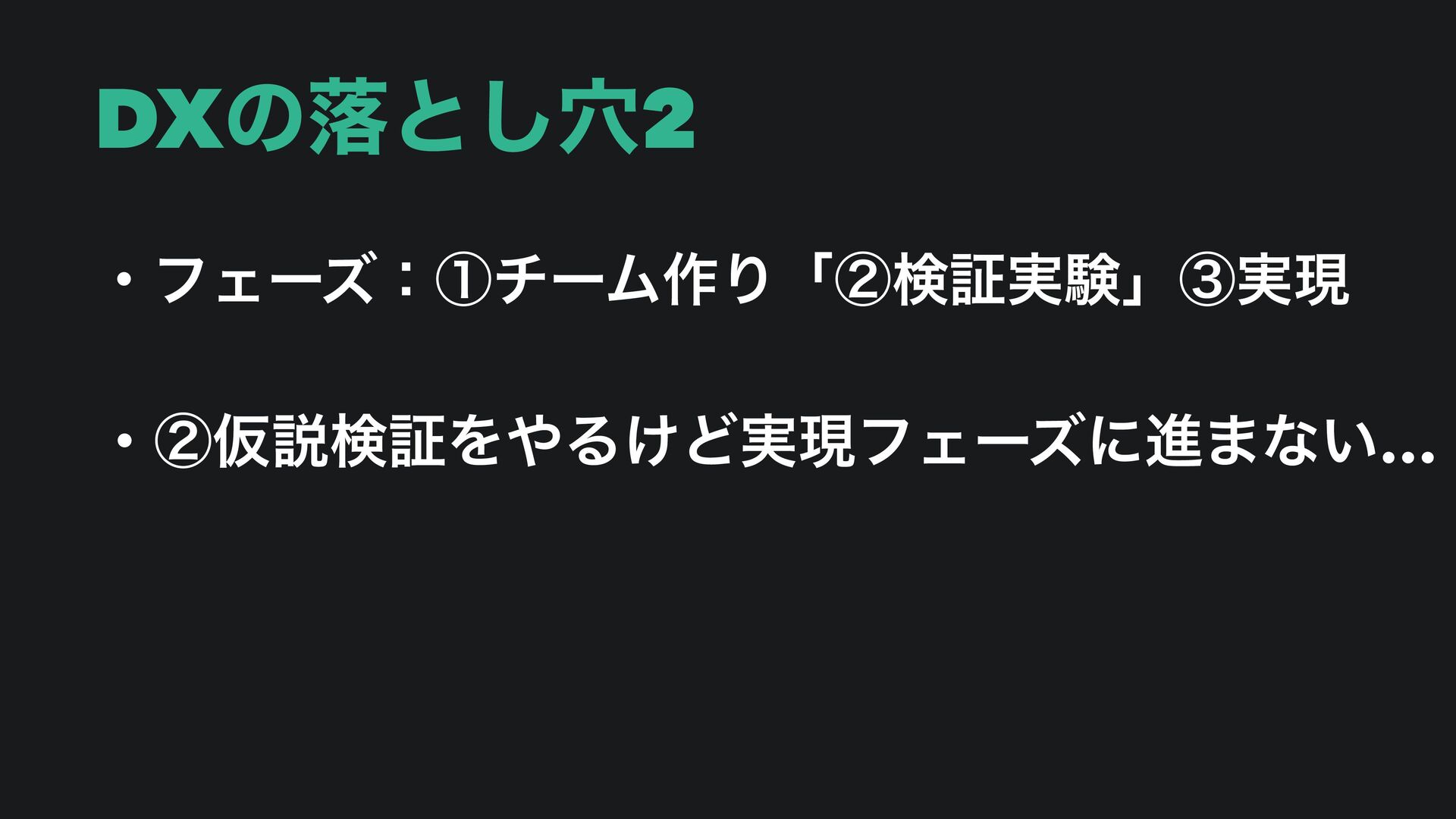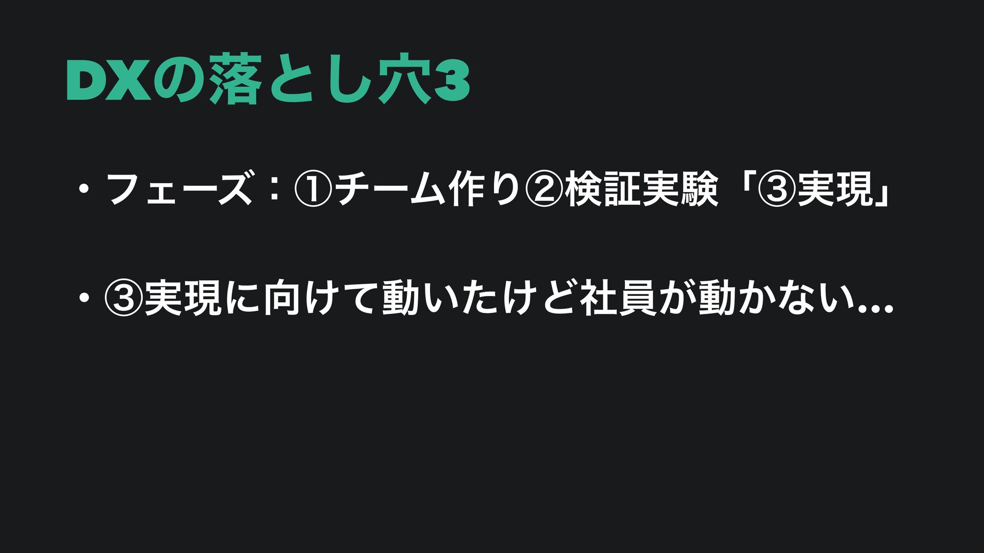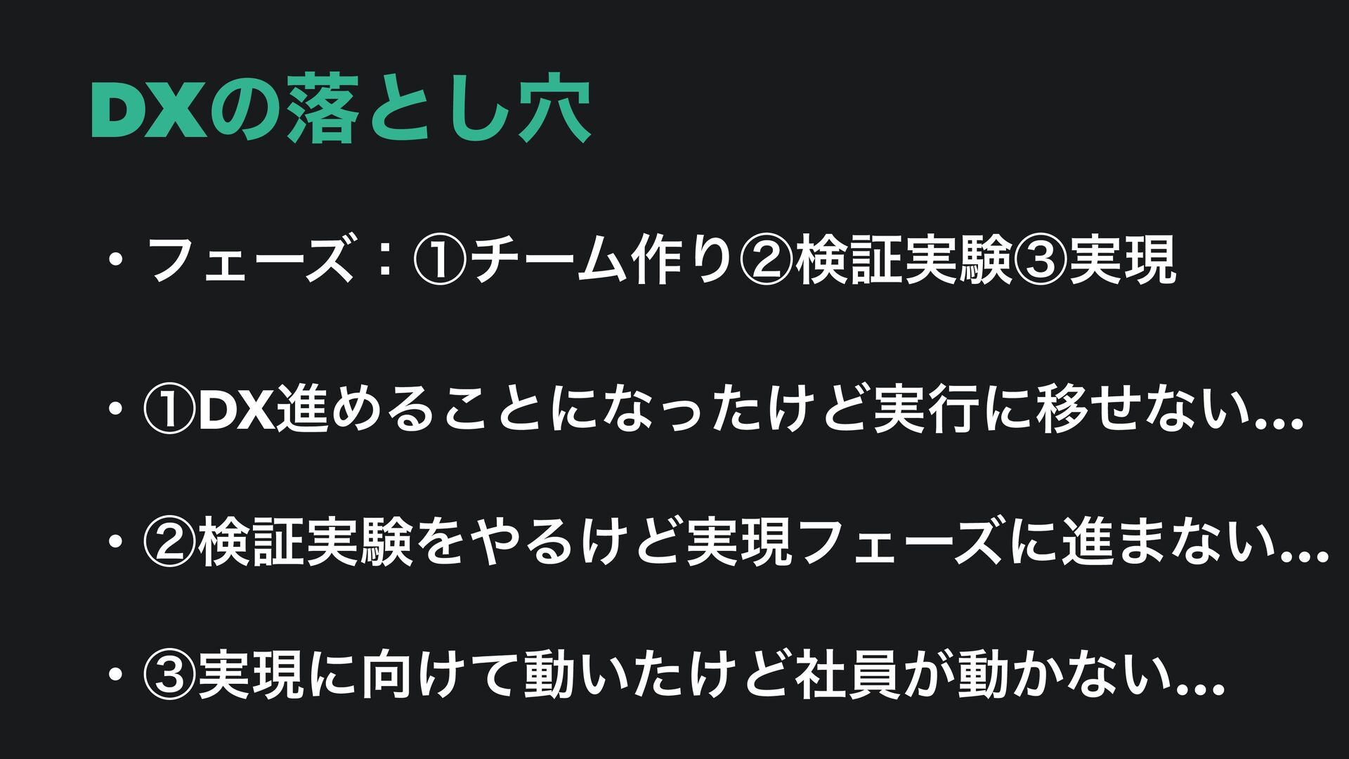 DXͷམͱ݀͠ ɾϑΣʔζɿᶃνʔϜ࡞Γᶄݕূ࣮ݧᶅ࣮ݱ ɾᶃDXਐΊΔ͜ͱʹͳ͚ͬͨͲ࣮ߦʹҠͤͳ͍… ɾᶄݕূ࣮ݧΛΔ͚Ͳ࣮ݱϑΣʔζʹਐ·ͳ͍… ɾᶅ࣮ݱʹ͚ͯಈ͍͚ͨͲࣾһ͕ಈ͔ͳ͍…