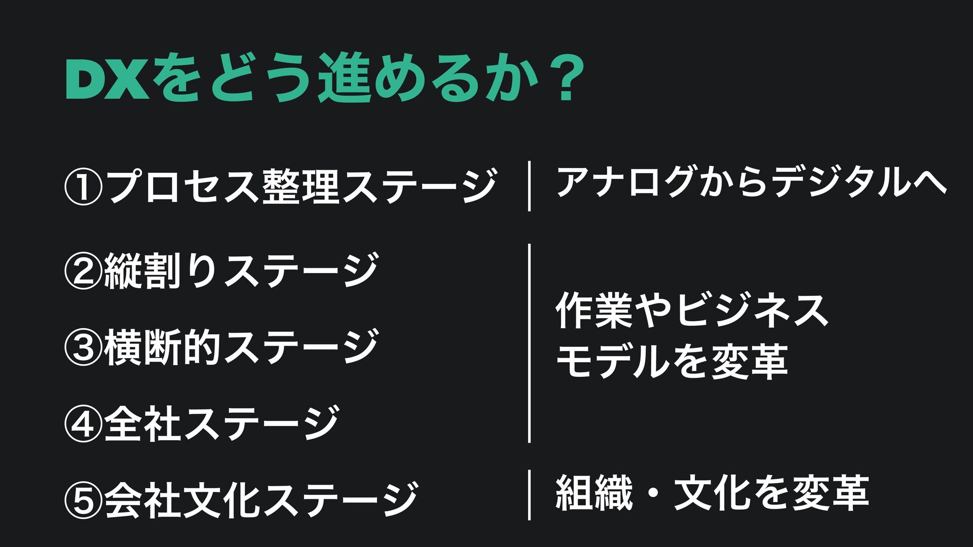 DXΛͲ͏ਐΊΔ͔ʁ ᶃϓϩηεཧεςʔδ ᶄॎׂΓεςʔδ ᶅԣஅతεςʔδ ᶆશࣾεςʔδ ᶇձࣾจԽεςʔδ Ξφϩά͔Βσδλϧ ࡞ۀϏδωε ϞσϧΛมֵ ৫ɾจԽΛมֵ