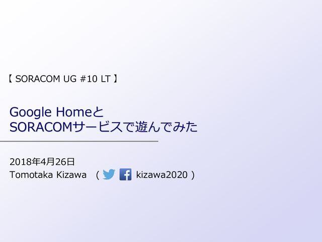 SORACOM UG #10 (2018/4/26) のLT発表資料です。 SORACOMサービスとGoogle Homeを連携させて、以下のデモンストレーションを行いました。 ① 音声でSORACOM Airの回線速度を変更する ② 音声でWioLTEのLED発光色を変更する