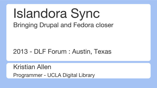 of shift to Islandora within UCLA DL • Digital Library community development options • Islandora Sync details Why the need? What does it do? • Questions