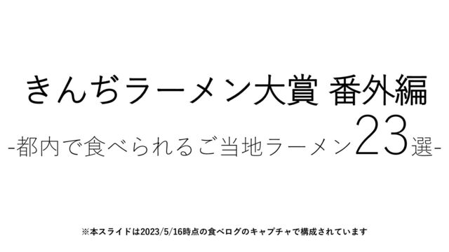 東京都内で食べられる、東京以外のご当地ラーメンを、各ジャンルごとに涙をのんで、1店に絞って列挙しただけのスライドです。 スライドといいつつ、中身は2023/5/16時点の食べログのキャプチャ画像のみです。