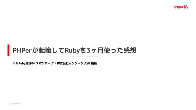 Confidential PHPerが転職してRubyを3ヶ月使った感想 大阪Ruby会議04 スポンサーLT / 株式会社インゲージ 久保 慶輔