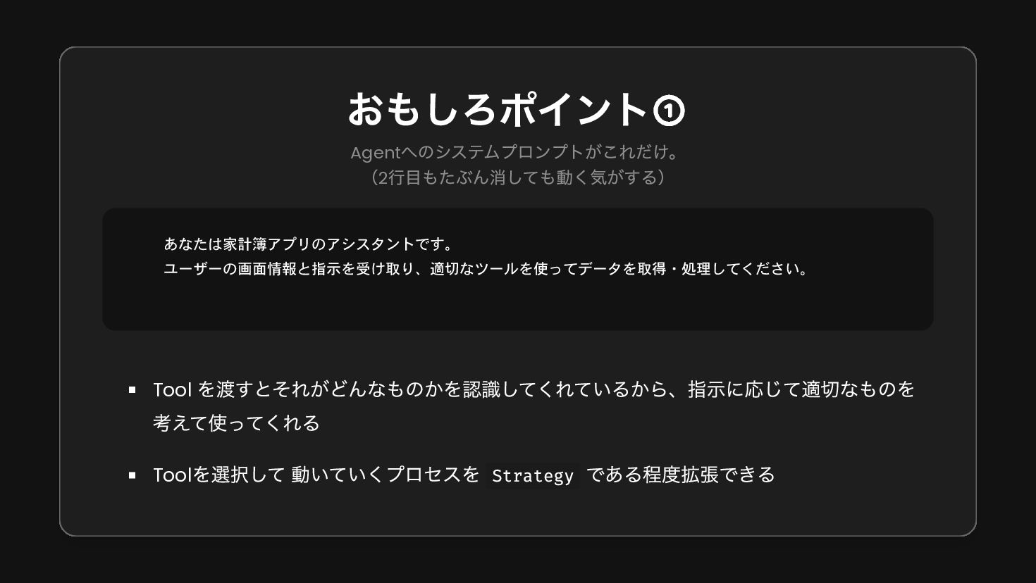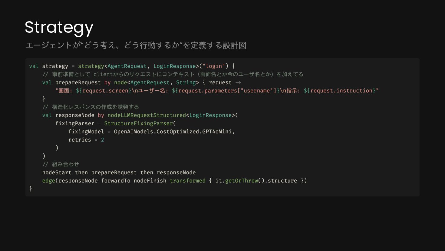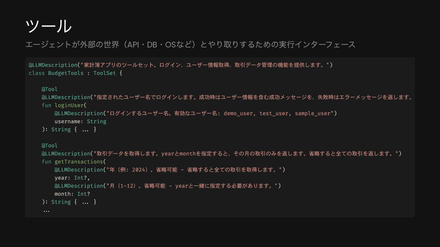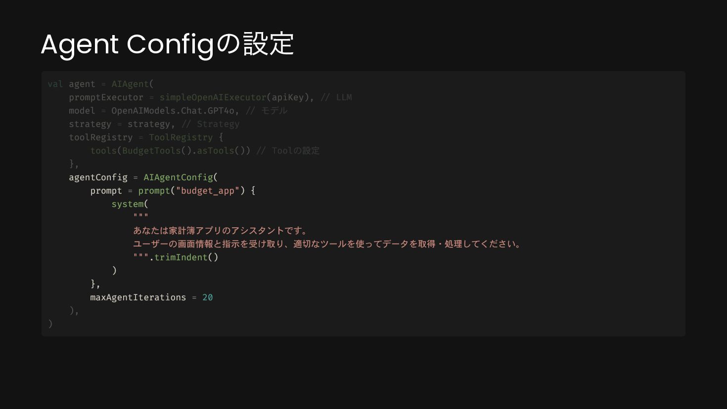system( """ あなたは家計簿アプリのアシスタントです。 ユーザーの画面情報と指示を受け取り、適切なツールを使ってデータを取得・処理してください。 """.trimIndent() ) }, maxAgentIterations = 20 val agent = AIAgent( promptExecutor = simpleOpenAIExecutor(apiKey), // LLM model = OpenAIModels.Chat.GPT4o, // モデル strategy = strategy, // Strategy toolRegistry = ToolRegistry { tools(BudgetTools().asTools()) // Toolの設定 }, ), )