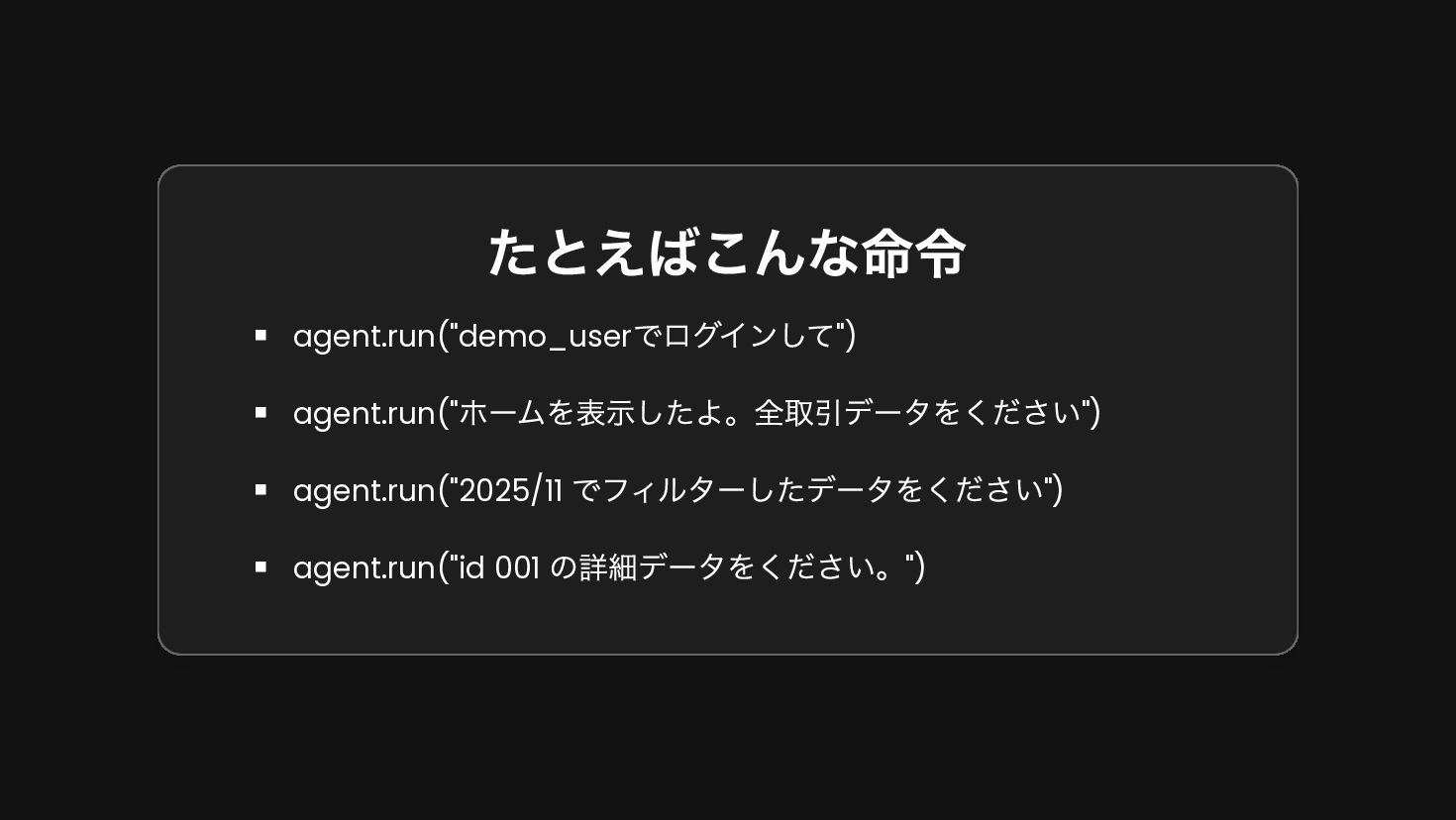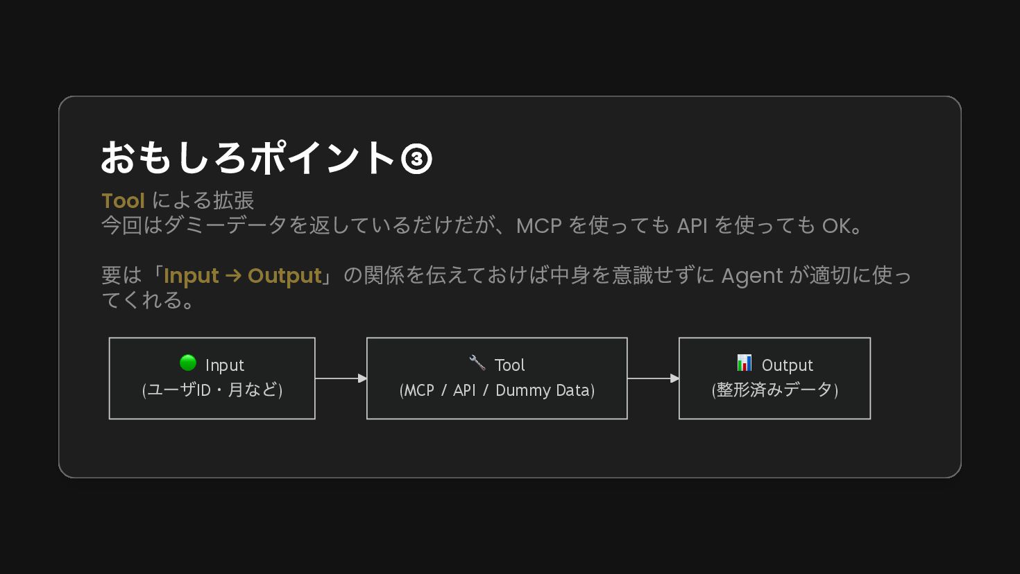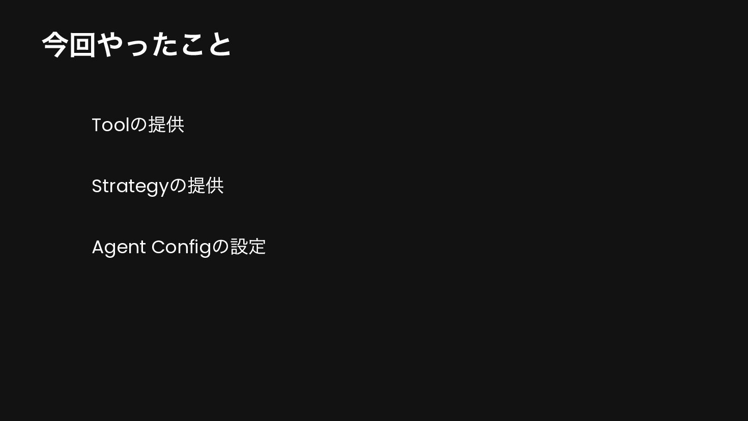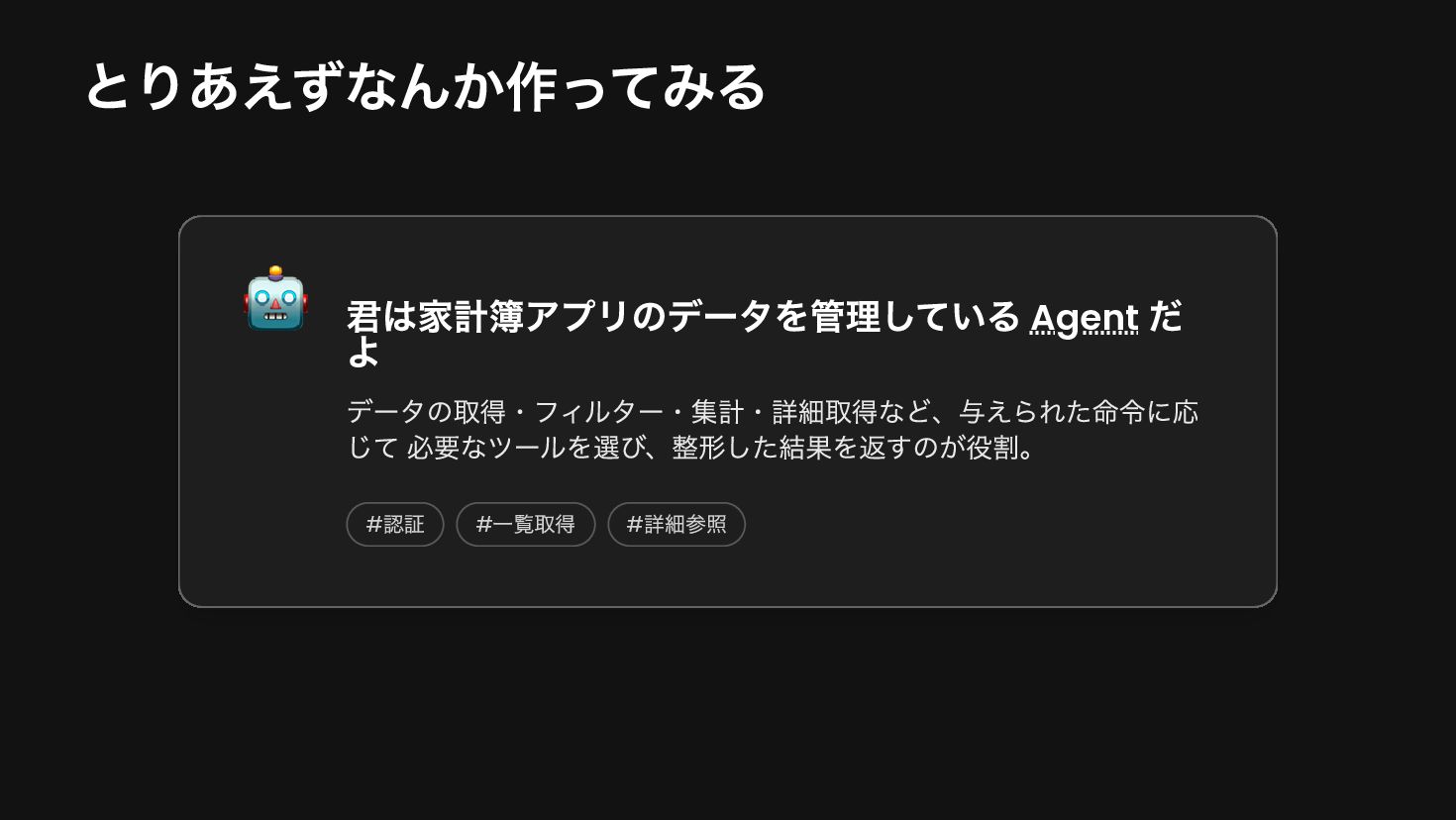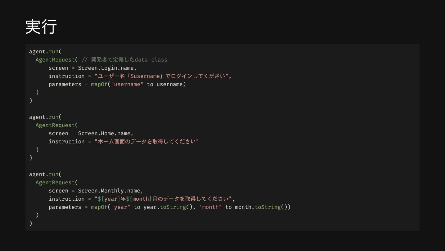 system( """ あなたは家計簿アプリのアシスタントです。 ユーザーの画面情報と指示を受け取り、適切なツールを使ってデータを取得・処理してください。 """.trimIndent() ) }, maxAgentIterations = 20 val agent = AIAgent( promptExecutor = simpleOpenAIExecutor(apiKey), // LLM model = OpenAIModels.Chat.GPT4o, // モデル strategy = strategy, // Strategy toolRegistry = ToolRegistry { tools(BudgetTools().asTools()) // Toolの設定 }, ), )