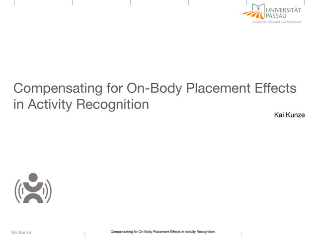 Related Work 4.8. Bibliography [5] K. Forster, D. Roggen, and G. Troster. Unsupervised classifier self-calibration through repeated context occurences: Is there robustness against sensor dis- placement to gain? In Wearable Computers, 2009. ISWC ’09. International Sym- posium on, pages 77 –84, 2009. [6] N. Kern, B. Schiele, H. Junker, P. Lukowicz, and G. Tröster. Wearable sensing to annotate meeting recordings. Personal and Ubiquitous Computing, 7(5):263– Device orientation is one of the major variations in sensor signals for context recognition. Compared to displacement and on-body placement, however, it is a bit better understood, as shown in the related work section 5.2. Large changes in device orientation with respect to the user’s body can influence the signal quality of sound and radio signals, if the microphone/antenna has strong directional characteristics. With respect to motion sensors, the vector norm can be used as an orientation-invariant feature. However, ignoring orientation means losing information, that can improve recognition and enable novel applications. Thus, we showed how to derive both vertical and horizontal orientation using only an accelerometer signal. Our proposed method is comparable to using the Euler Angles and GPS. Yet, of course it has the advantage that is uses an accelerometer only and is not limited to being outside (gps) or susceptible to metal (magnetic compass). Of course, the experimental setup and trials presented are only an initial result to underline the usefulness of the approach. 5.7 Bibliography [1] U. Blanke and B. Schiele. Sensing location in the pocket. Ubicomp Poster Session, page 2, Aug 2008. [2] F. Ichikawa, J. Chipchase, and R. Grignani. Where’s the phone? a study of mobile phone location in public spaces. Mobile Technology, Applications and Systems, 2005 2nd International Conference on, pages 1 – 8, Oct 2005. [3] K. Kunze and P. Lukowicz. Using acceleration signatures from everyday ac- tivities for on-body device location. Wearable Computers, 2007 11th IEEE Inter- national Symposium on, pages 115 – 116, Sep 2007. [4] K. Kunze and P. Lukowicz. Dealing with sensor displacement in motion- J. Shaffer, and F. L. Wong. Sensay: a context-aware mobile phone. In Wearable Computers, 2003. Proceedings. Seventh IEEE International Symposium on, pages 248 – 249, oct. 2003. [48] B. Smith, L. Bass, and J. Siegel. On site maintenance using a wearable com- puter system. In Conference on Human Factors in Computing Systems, pages 119–120. ACM New York, NY, USA, 1995. [49] M. Stager and P. Lukowicz. Power and accuracy trade-offs in sound-based context recognition systems. Pervasive and Mobile Computing, 2007. [50] T. Starner, B. Schiele, and A. Pentland. Visual contextual awareness in wear- able computing. In Proceeding of the Second Int. Symposium on Wearable Com- puting. Pittsburgh, October, 1998. [51] U. Steinhoff and B. Schiele. Dead reckoning from the pocket - an experimen- tal study. In Eighth Annual IEEE International Conference on Pervasive Comput- ing and Communications (PerCom 2010), Mannheim, Germany, 04/2010 2010. IEEE, IEEE. [52] J. Sunkpho, J. Garrett Jr, A. Smailagic, and D. Siewiorek. MIA: A Wearable Computer for Bridge Inspectors. In Proceedings of the 2nd IEEE International Symposium on Wearable Computers, page 160. IEEE Computer Society Wash- ington, DC, USA, 1998. [53] E. Tapia, S. Intille, and K. Larson. Activity recognition in the home using sim- ple and ubiquitous sensors. In A. Ferscha and F. Mattern, editors, Pervasive Computing, volume 3001 of Lecture Notes in Computer Science, pages 158–175. Springer Berlin / Heidelberg, 2004. [54] S. Thiemjarus. A device-orientation independent method for activity recog- most work so far discussed only displacement robust features, putting up with a loss of information.