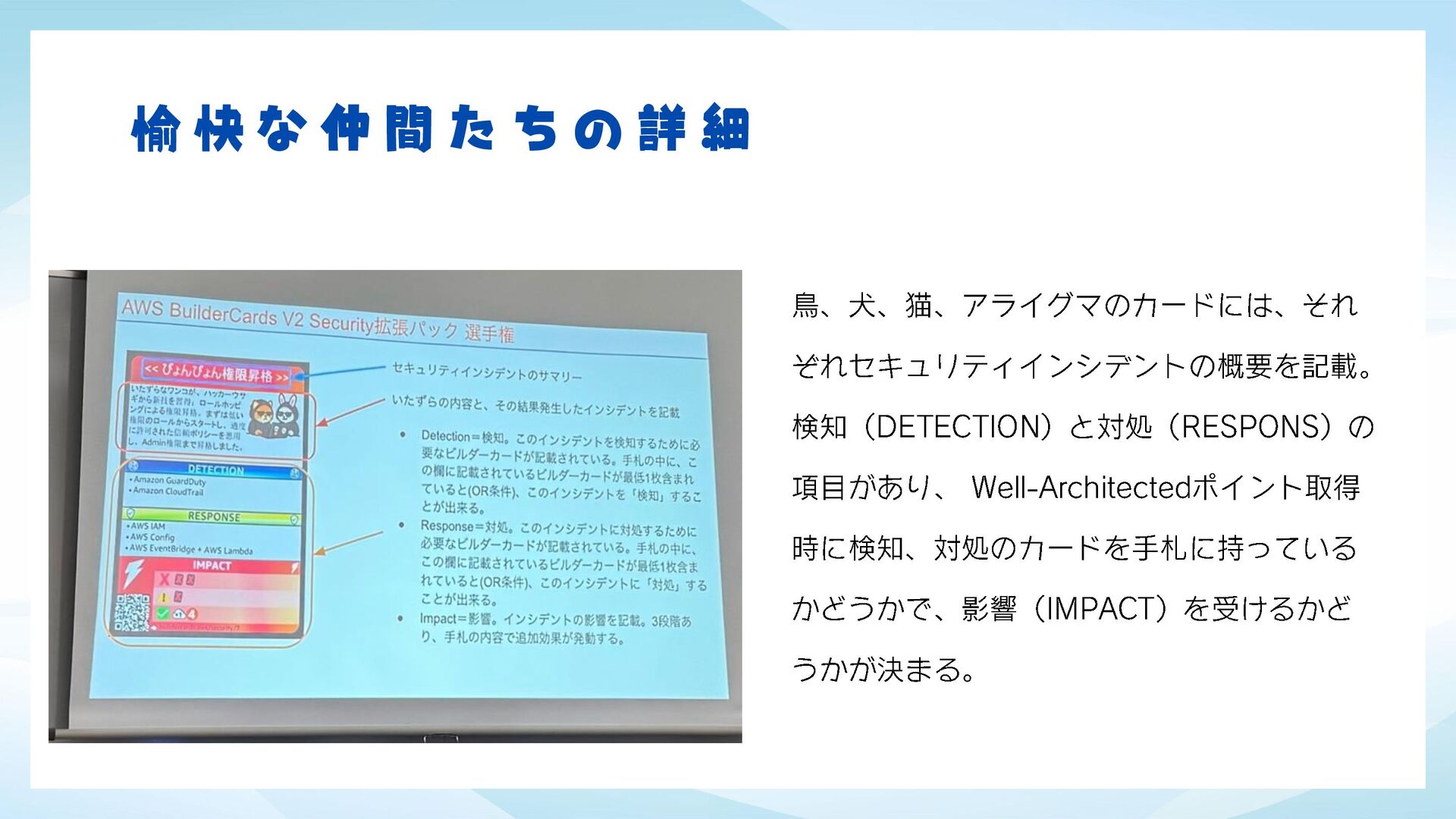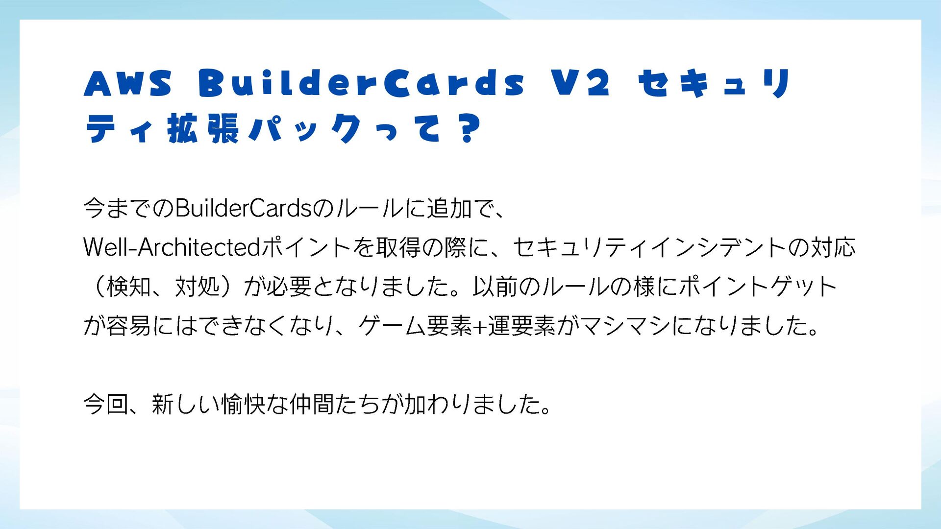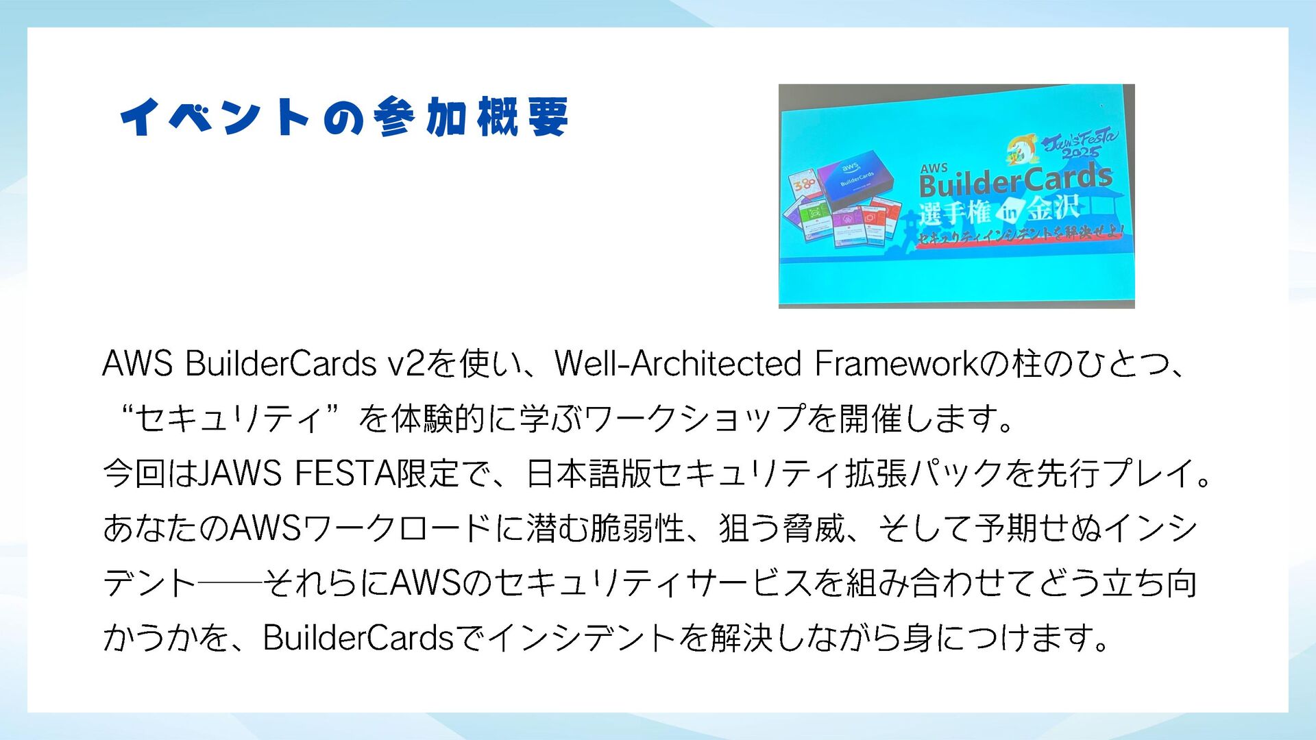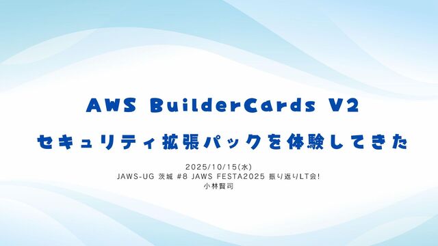 JAWS-UG 茨城 #8 JAWS FESTA2025 振り返りLT会!でJAWS FESTA2025 金沢で体験してきたAWS BuilderCards V2 セキュリティ拡張パックの感想になります。