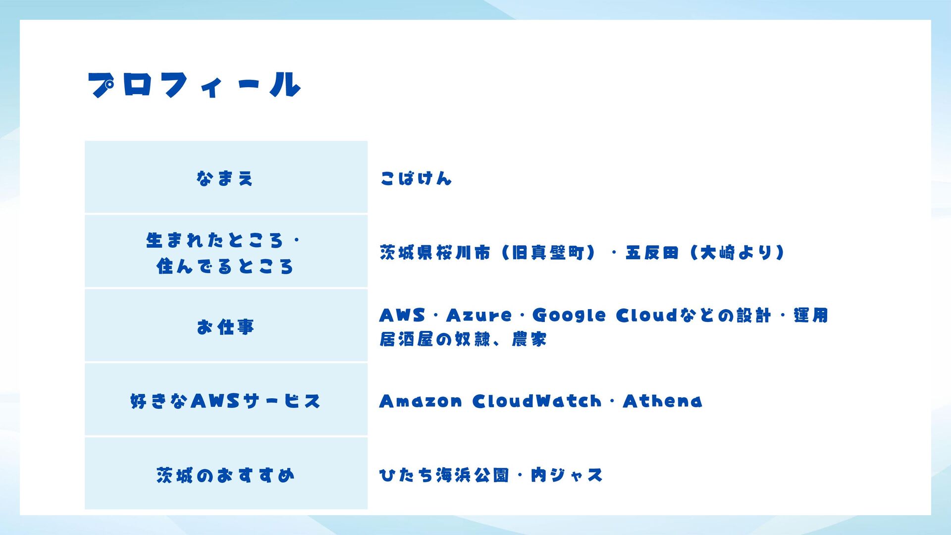 なまえ こばけん 生まれたところ・ 住んでるところ 茨城県桜川市(旧真壁町)・五反田(大崎より) お仕事 AWS・Azure・Google Cloudなどの設計・運用 居酒屋の奴隷、農家 好きなAWSサービス