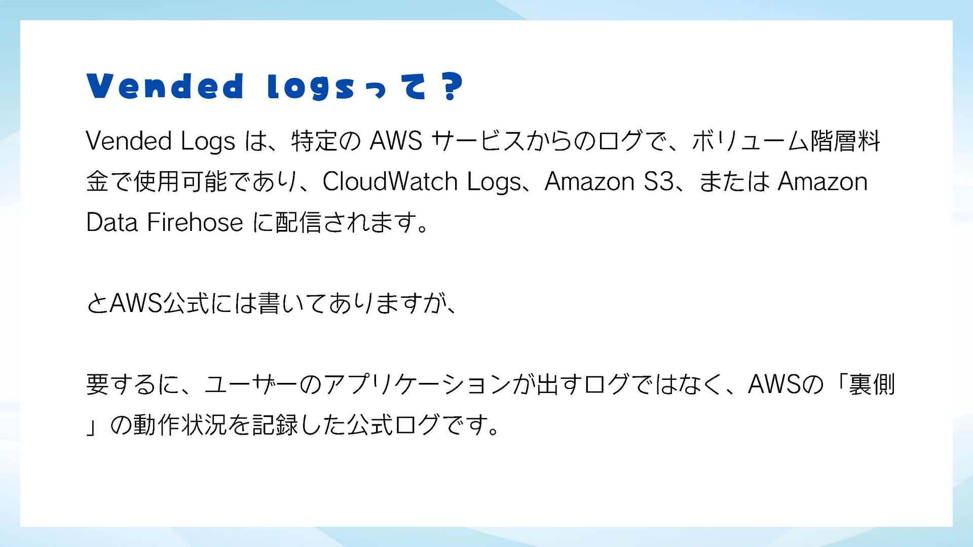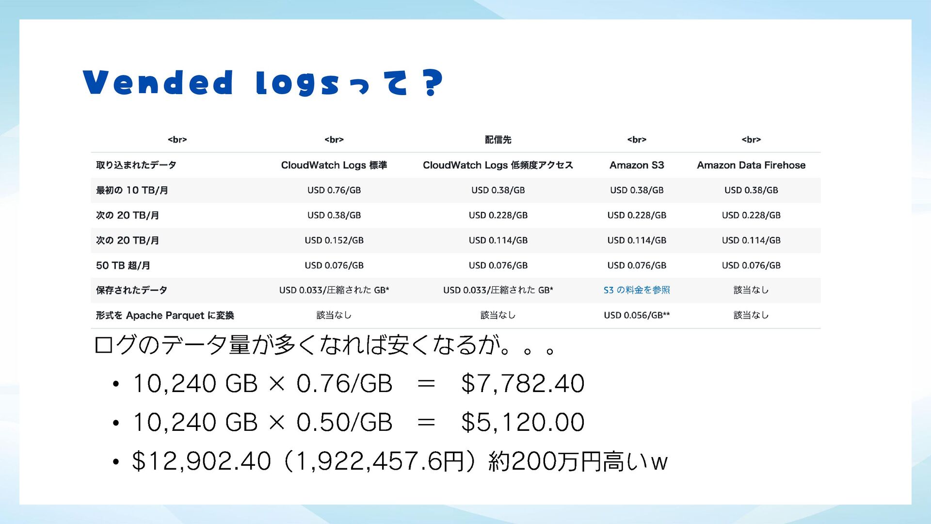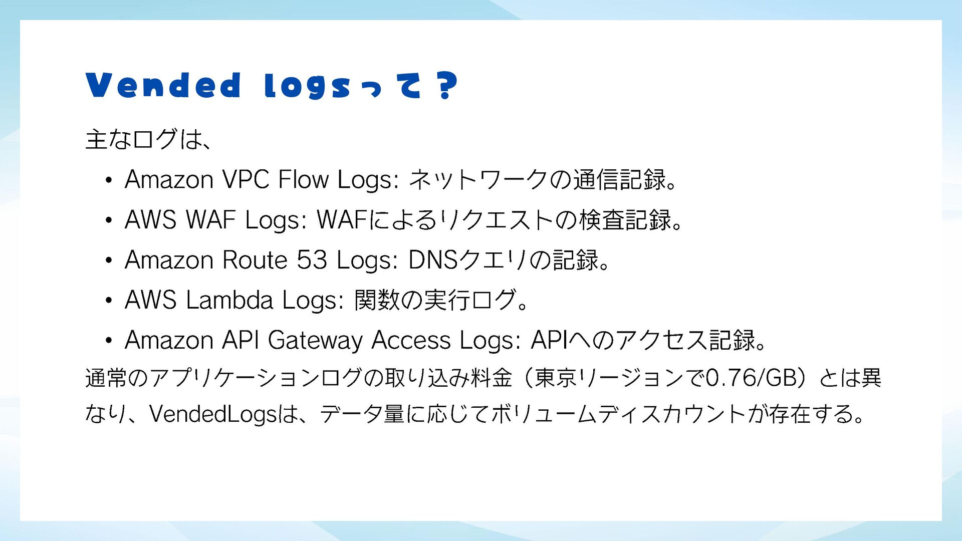 Logs: WAF 土土土土土土土土土土土土土土 • Amazon Route 53 Logs: DNS 土土土土土土土 • AWS Lambda Logs: 土土土土土土土土 • Amazon API Gateway Access Logs: API 土土土土土土土土土 土土土土土土土土土土土土土土土土土土土土土土土土土土土土土 0.76/GB 土土土土 土土土 VendedLogs 土土土土土土土土土土土土土土土土土土土土土土土土土土土土 Vended logsって?