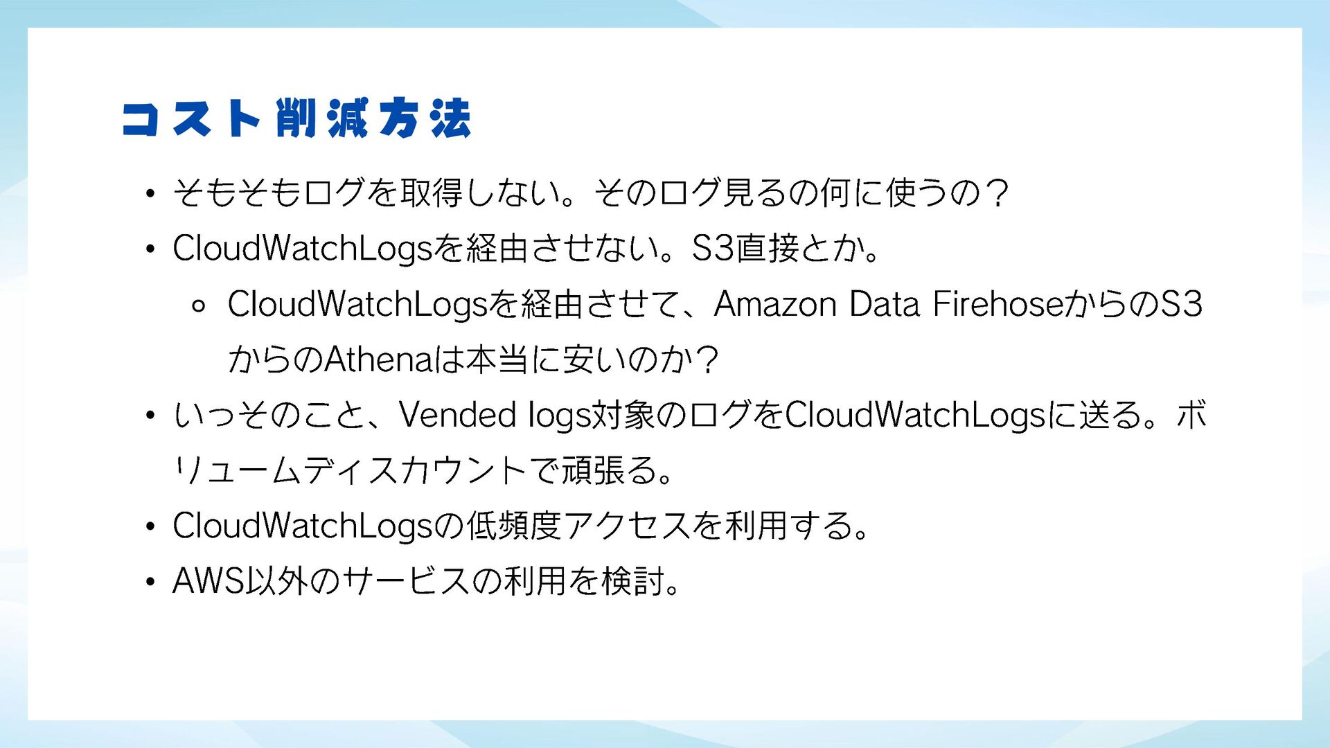 Amazon Data Firehose 土土土 S3 土土土 Athena 土土土土土土土土土 • 土土土土土土土 Vended logs 土土土土土土 CloudWatchLogs 土土土土土 土土土土土土土土土土土土土土土土 • CloudWatchLogs 土土土土土土土土土土土土土土 • AWS 土土土土土土土土土土土土土土 コスト削減方法