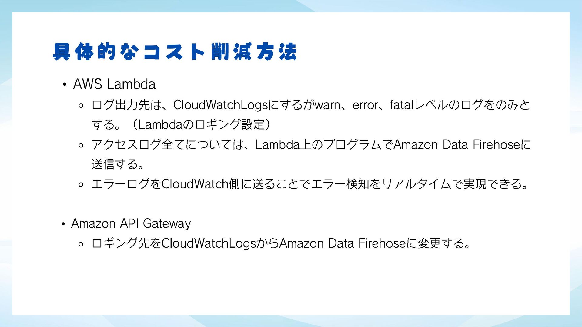 土土土土 Lambda 土土土土土土土土 ⚬ 土土土土土土土土土土土土土土 Lambda 土土土土土土土土 Amazon Data Firehose 土 土土土土土 ⚬ 土土土土土土 CloudWatch 土土土土土土土土土土土土土土土土土土土土土土土土土土 • Amazon API Gateway ⚬ 土土土土土土 CloudWatchLogs 土土 Amazon Data Firehose 土土土土土土 具体的なコスト削減方法