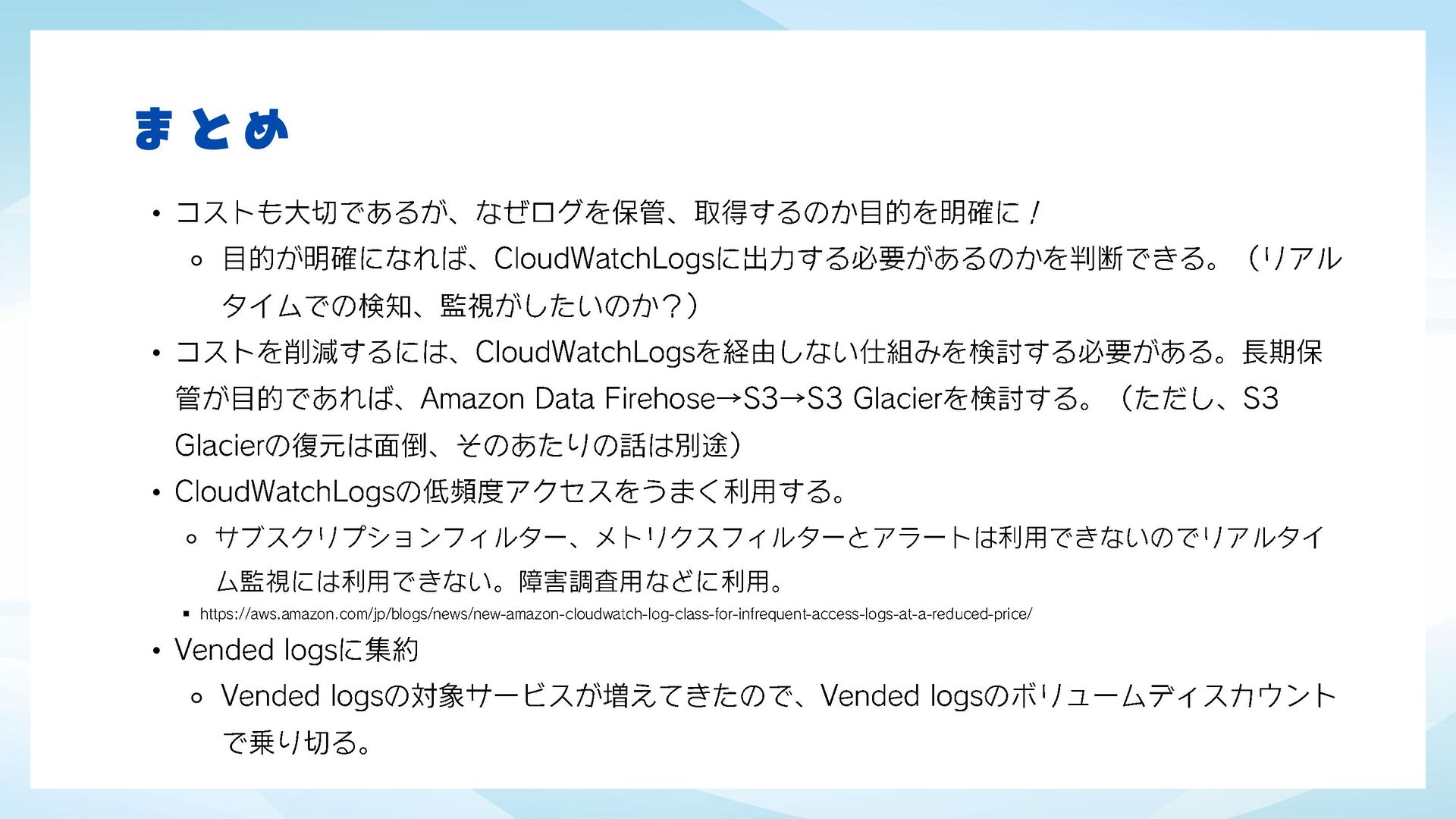 土土土土土土土土土土土土土土土土土土土土土土土 土土土土土土土土土 Amazon Data Firehose→S3→S3 Glacier 土土土土土土土土土土土 S3 Glacier 土土土土土土土土土土土土土土土土土土 • CloudWatchLogs 土土土土土土土土土土土土土土土土土 ⚬ 土土土土土土土土土土土土土土土土土土土土土土土土土土土土土土土土土土土土土土土土土土土土 土土土土土土土土土土土土土土土土土土土土土土土 ■ https://aws.amazon.com/jp/blogs/news/new -amazon -cloudwatch -log -class -for-infrequent -access -logs -at-a-reduced -price/ • Vended logs 土土土 ⚬ Vended logs 土土土土土土土土土土土土土土土土 Vended logs 土土土土土土土土土土土土土 土土土土土土 まとめ
