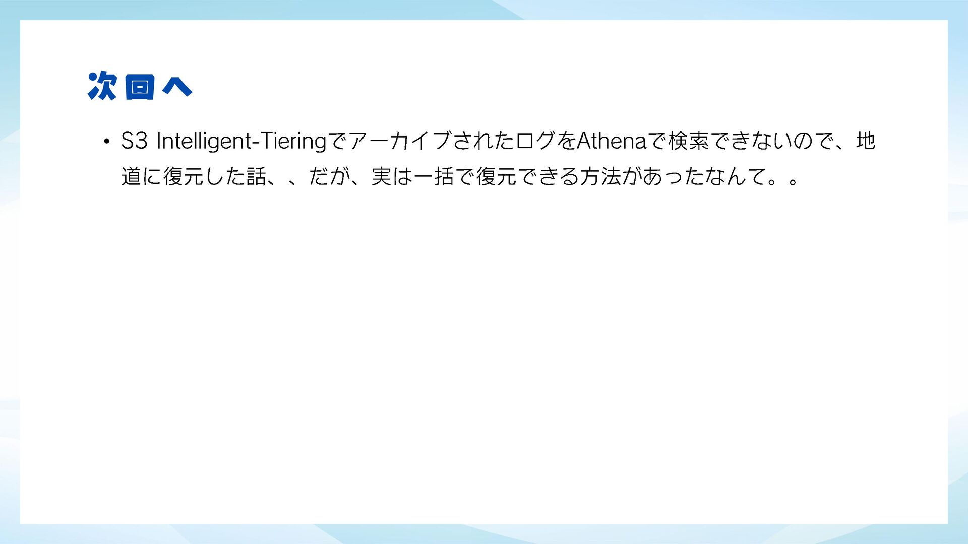 • S3 Intelligent -Tiering 土土土土土土土土土土土土 Athena 土土土土土土土土土土土 土土土土土土土土土土土土土土土土土土土土土土土土土土土土土土土土土 次回へ