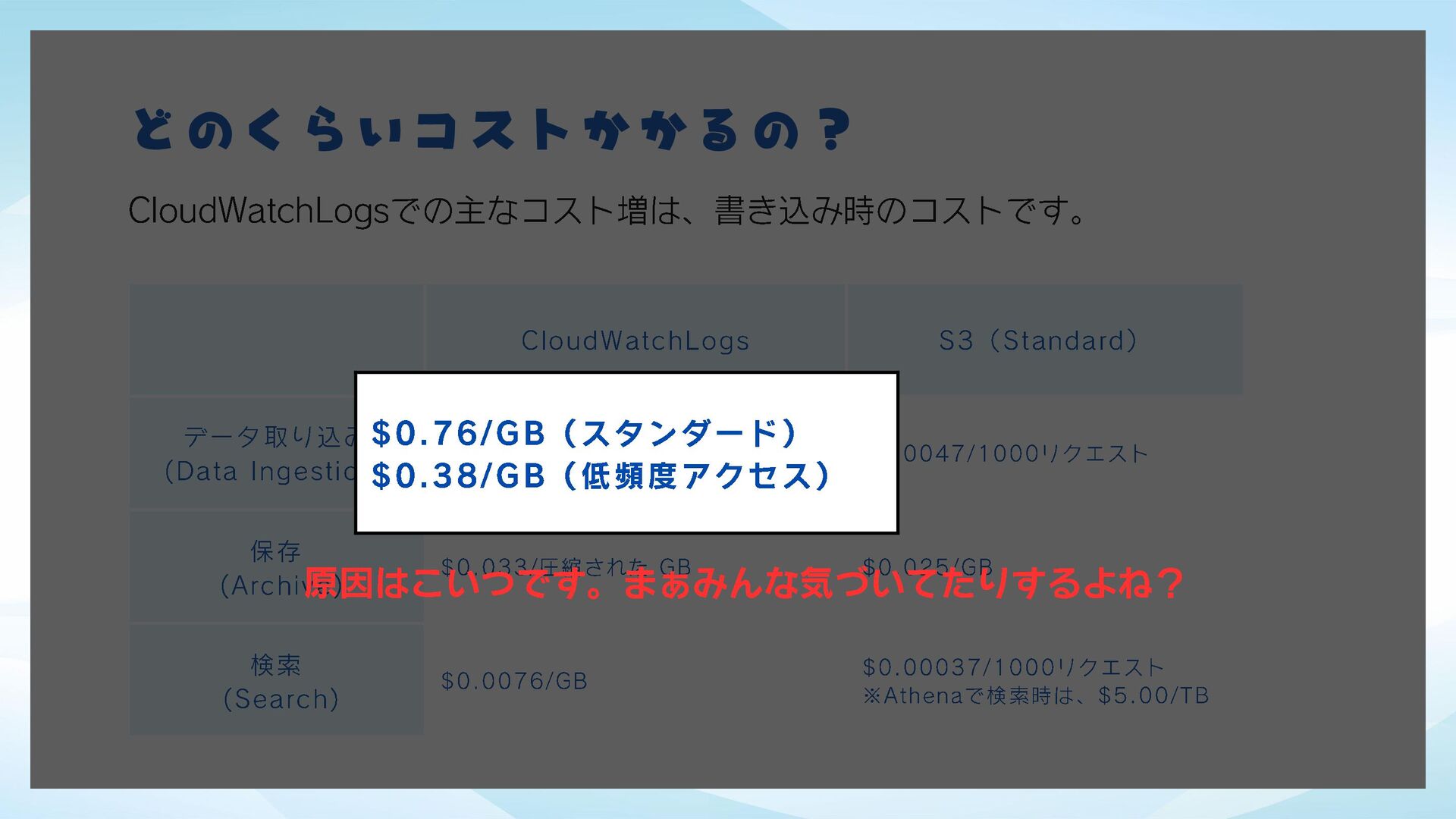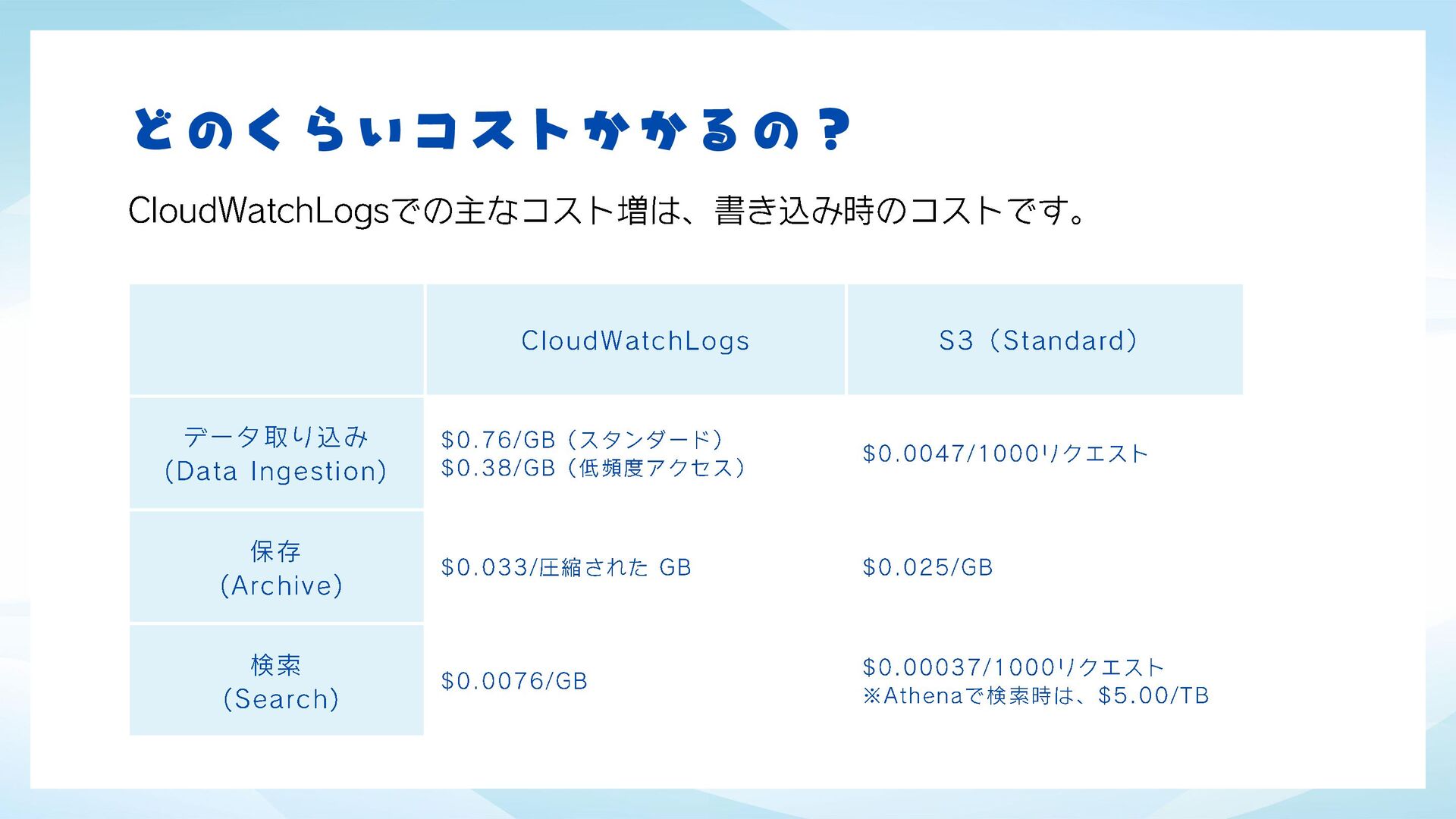 どのくらいコストかかるの? CloudWatchLogs 土土土土土土土土土土土土土土土土土土土土土土 CloudWatchLogs S3 土 Standard 土 土土土土土土土 (Data
