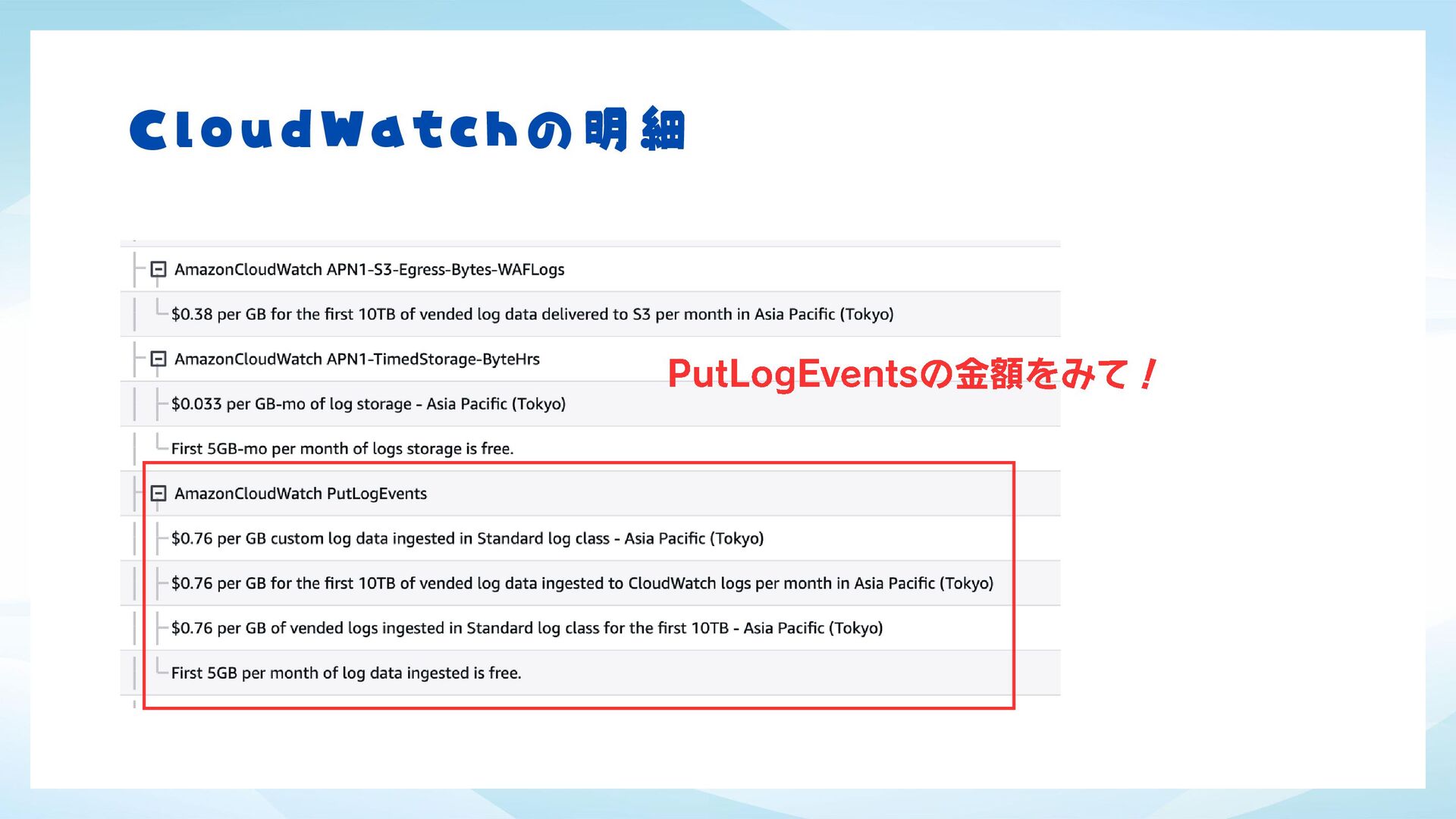 CloudWatchの明細 PutLogEvents アアアアアアア