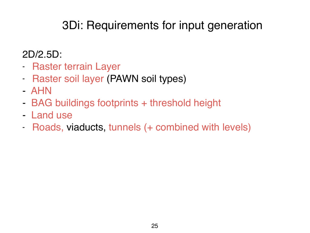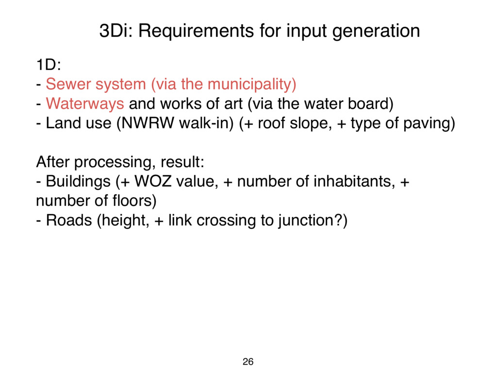 (via the municipality) - Waterways and works of art (via the water board) - Land use (NWRW walk-in) (+ roof slope, + type of paving) After processing, result: - Buildings (+ WOZ value, + number of inhabitants, + number of floors) - Roads (height, + link crossing to junction?)
