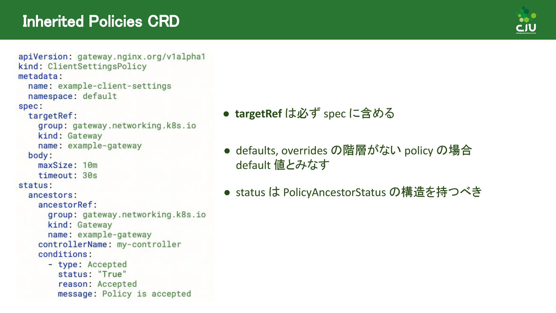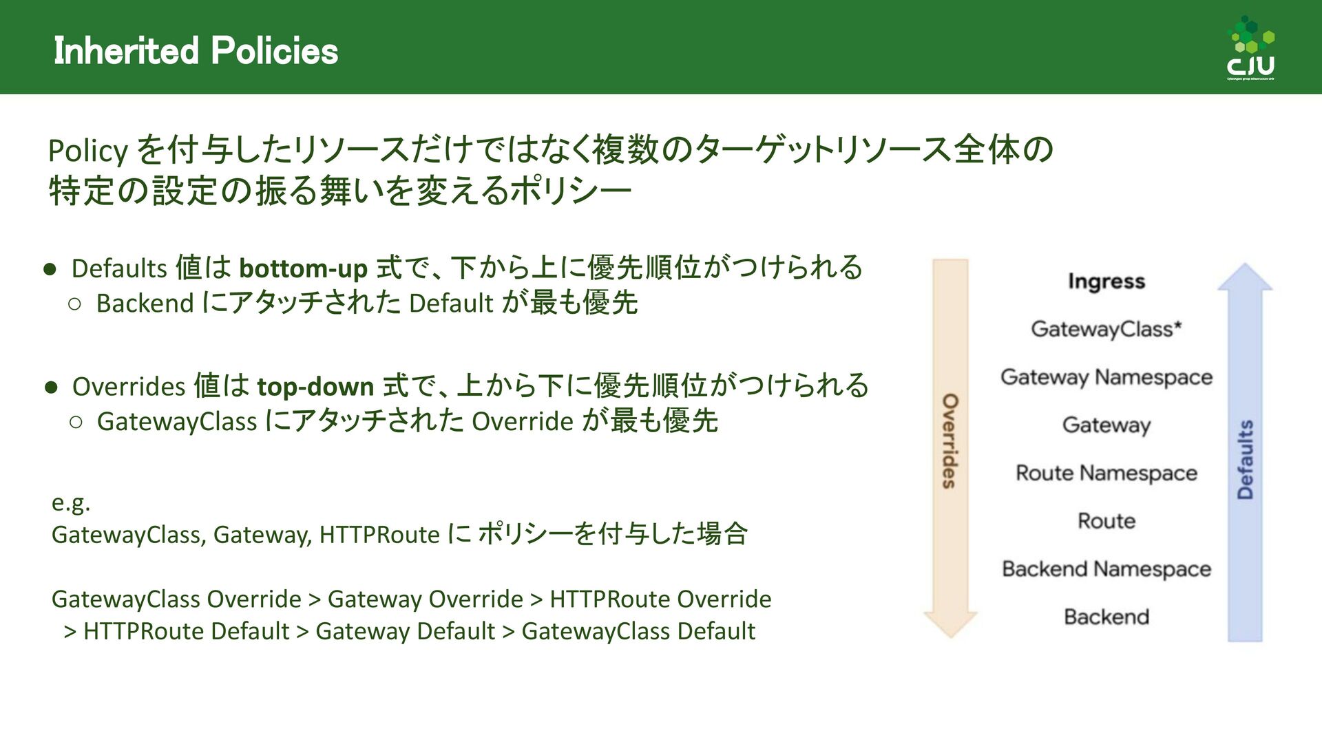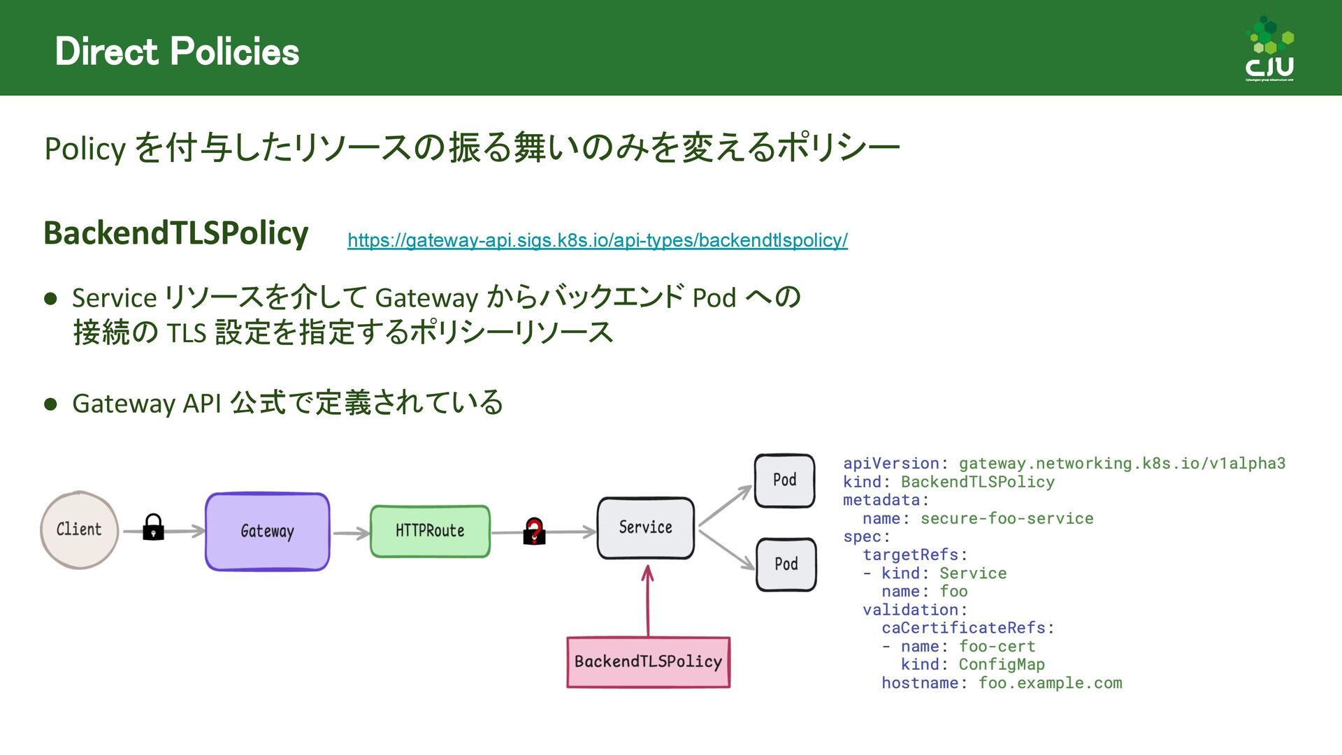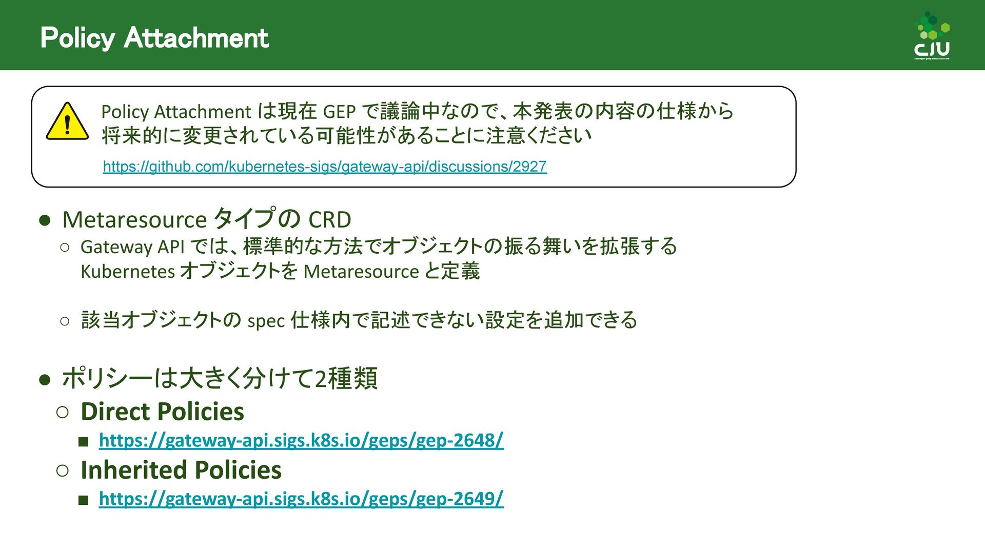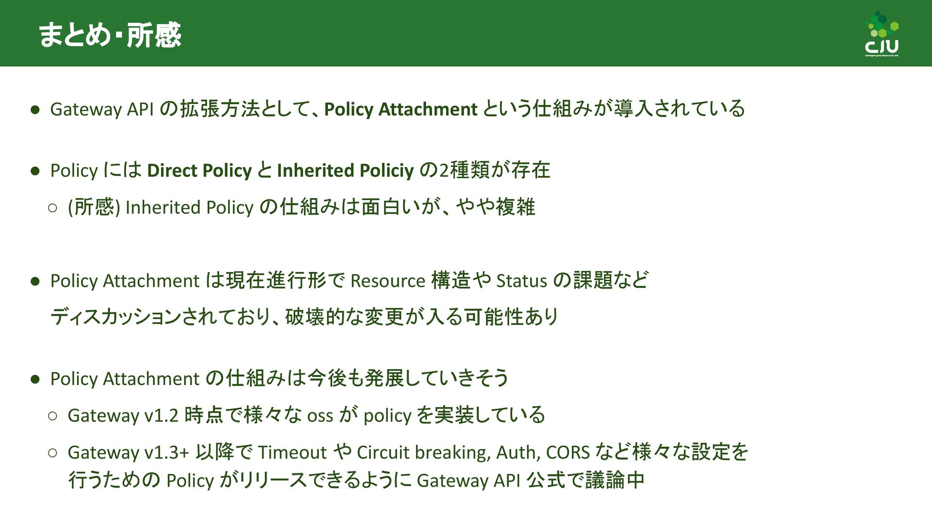 には Direct Policy と Inherited Policiy の2種類が存在 ◦ (所感) Inherited Policy の仕組みは面白いが、やや複雑 • Policy Attachment は現在進行形で Resource 構造や Status の課題など ディスカッションされており、破壊的な変更が入る可能性あり • Policy Attachment の仕組みは今後も発展していきそう ◦ Gateway v1.2 時点で様々な oss が policy を実装している ◦ Gateway v1.3+ 以降で Timeout や Circuit breaking, Auth, CORS など様々な設定を 行うための Policy がリリースできるように Gateway API 公式で議論中