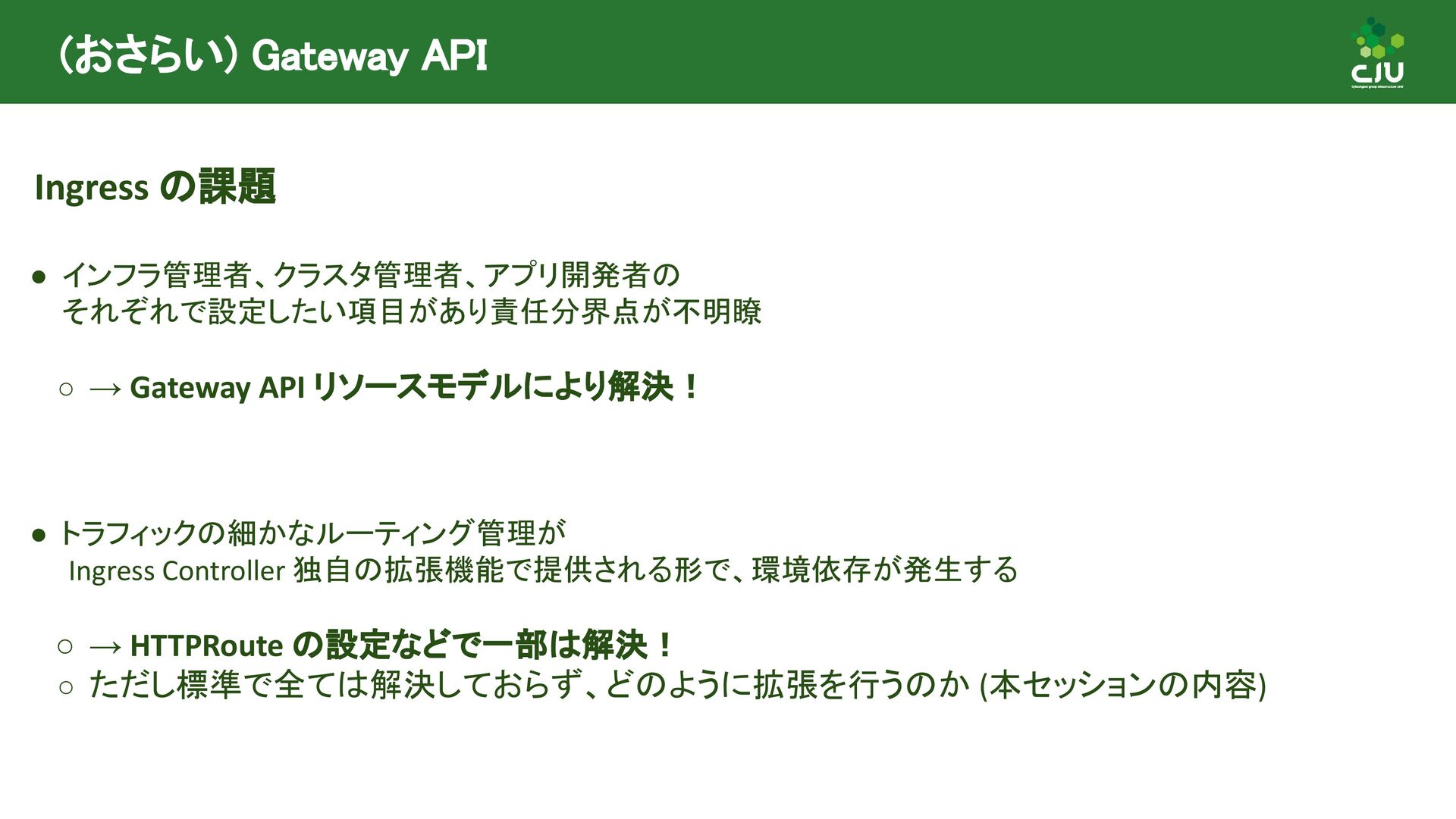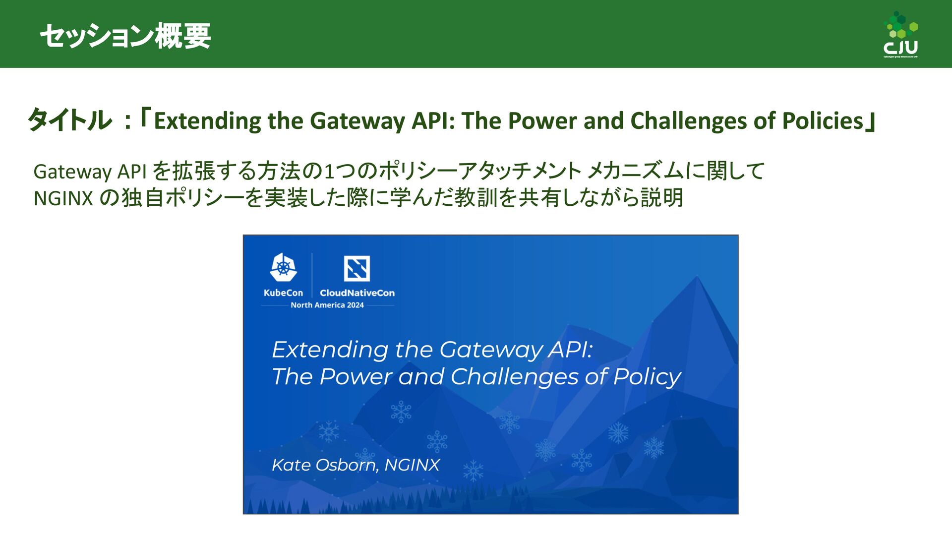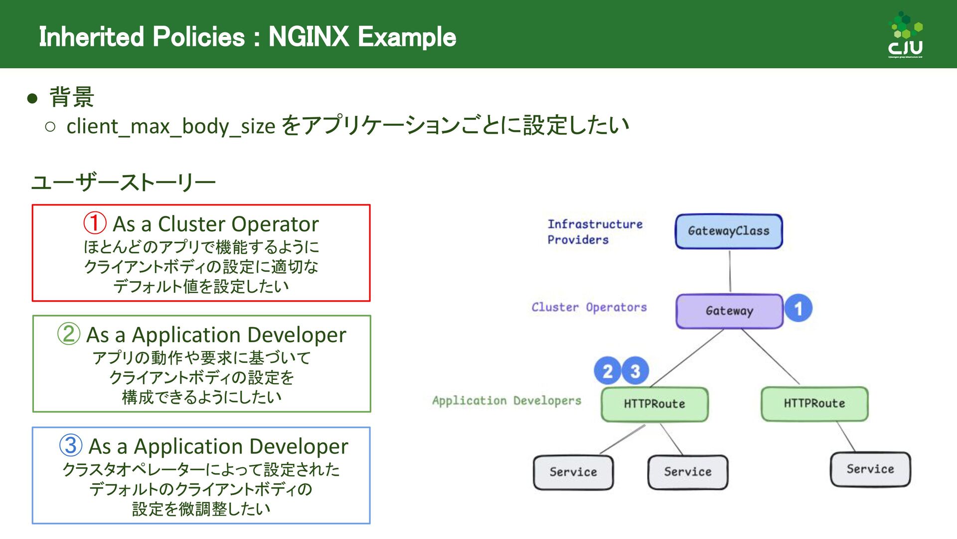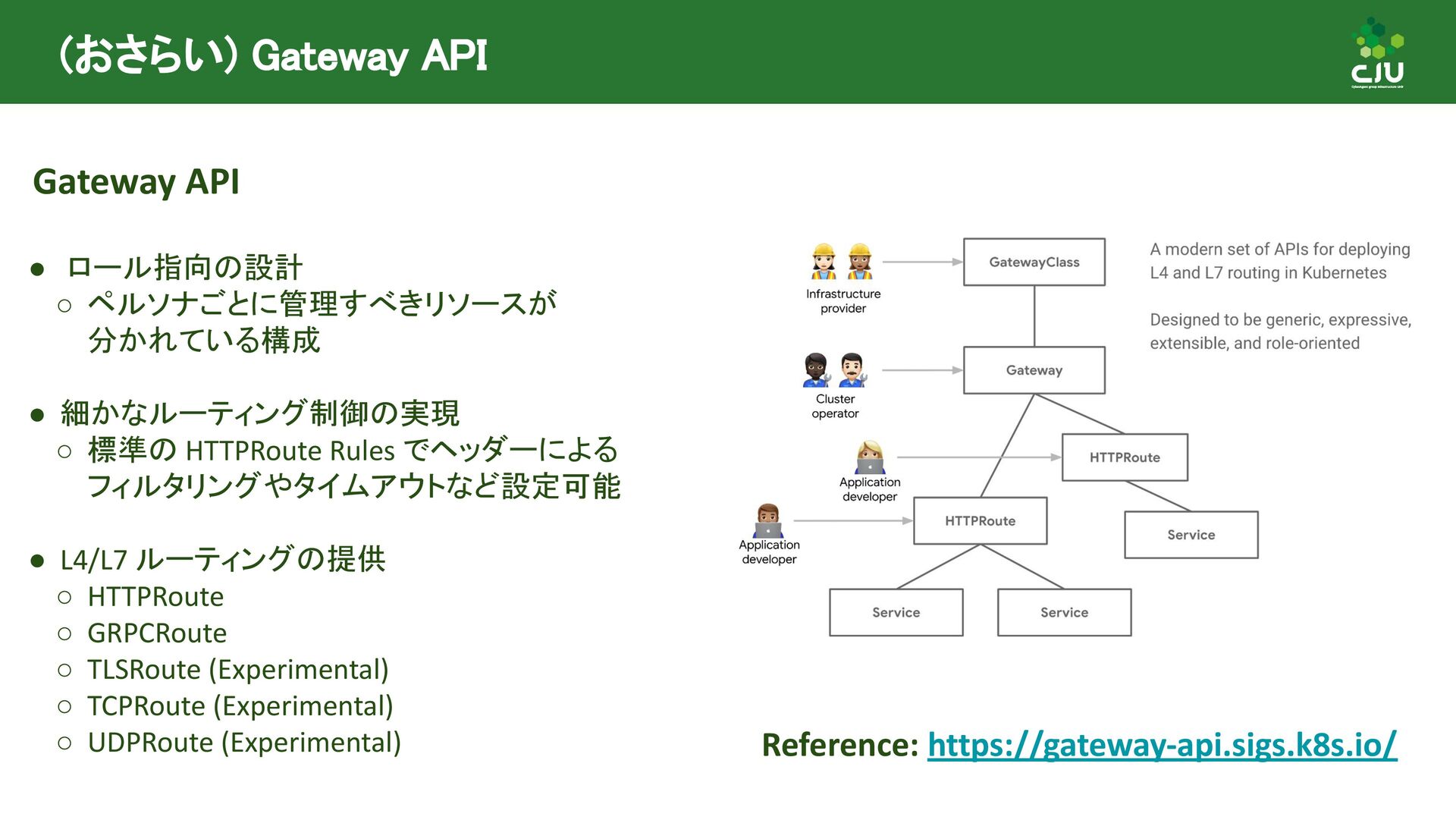 には Direct Policy と Inherited Policiy の2種類が存在 ◦ (所感) Inherited Policy の仕組みは面白いが、やや複雑 • Policy Attachment は現在進行形で Resource 構造や Status の課題など ディスカッションされており、破壊的な変更が入る可能性あり • Policy Attachment の仕組みは今後も発展していきそう ◦ Gateway v1.2 時点で様々な oss が policy を実装している ◦ Gateway v1.3+ 以降で Timeout や Circuit breaking, Auth, CORS など様々な設定を 行うための Policy がリリースできるように Gateway API 公式で議論中
