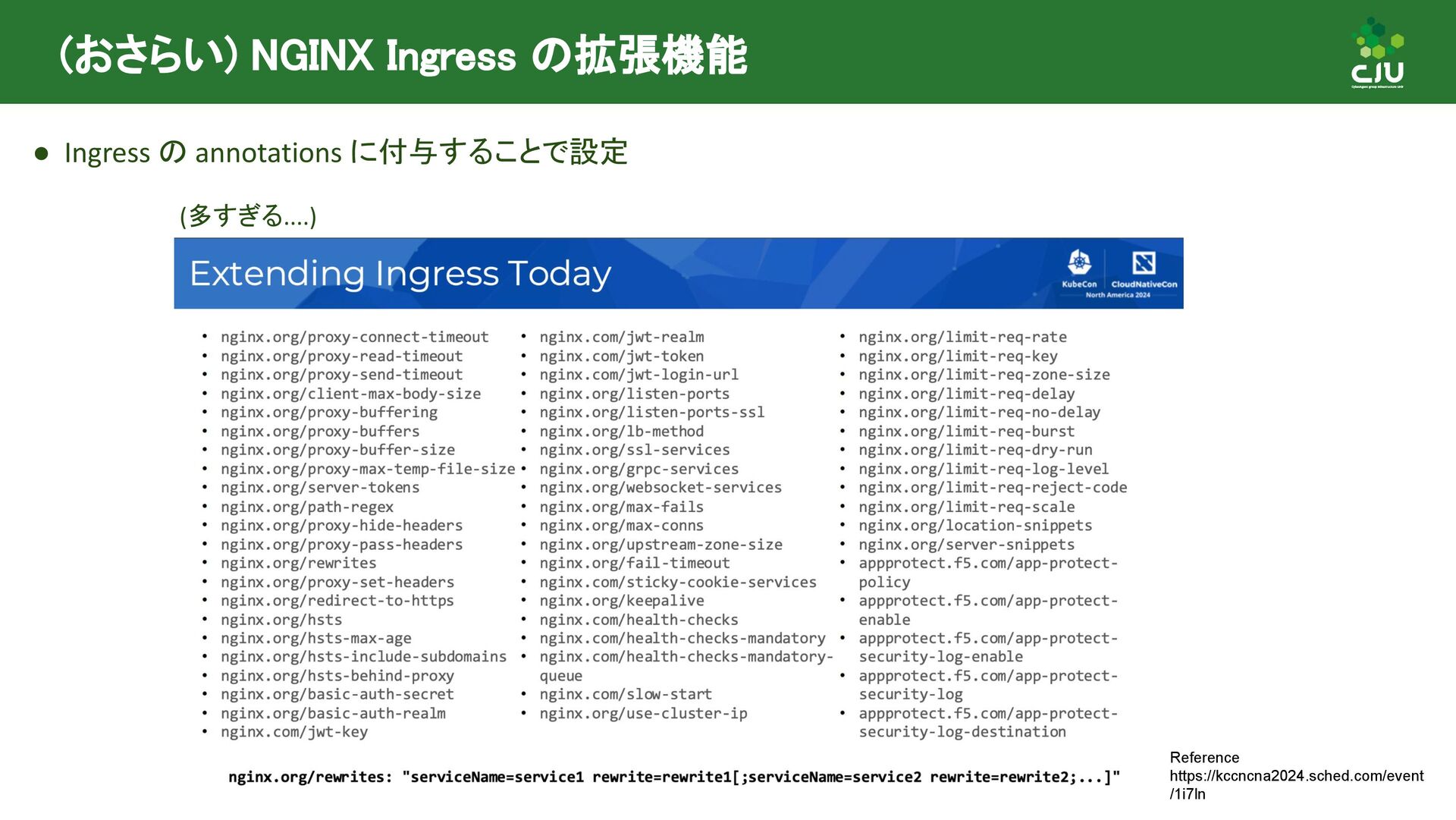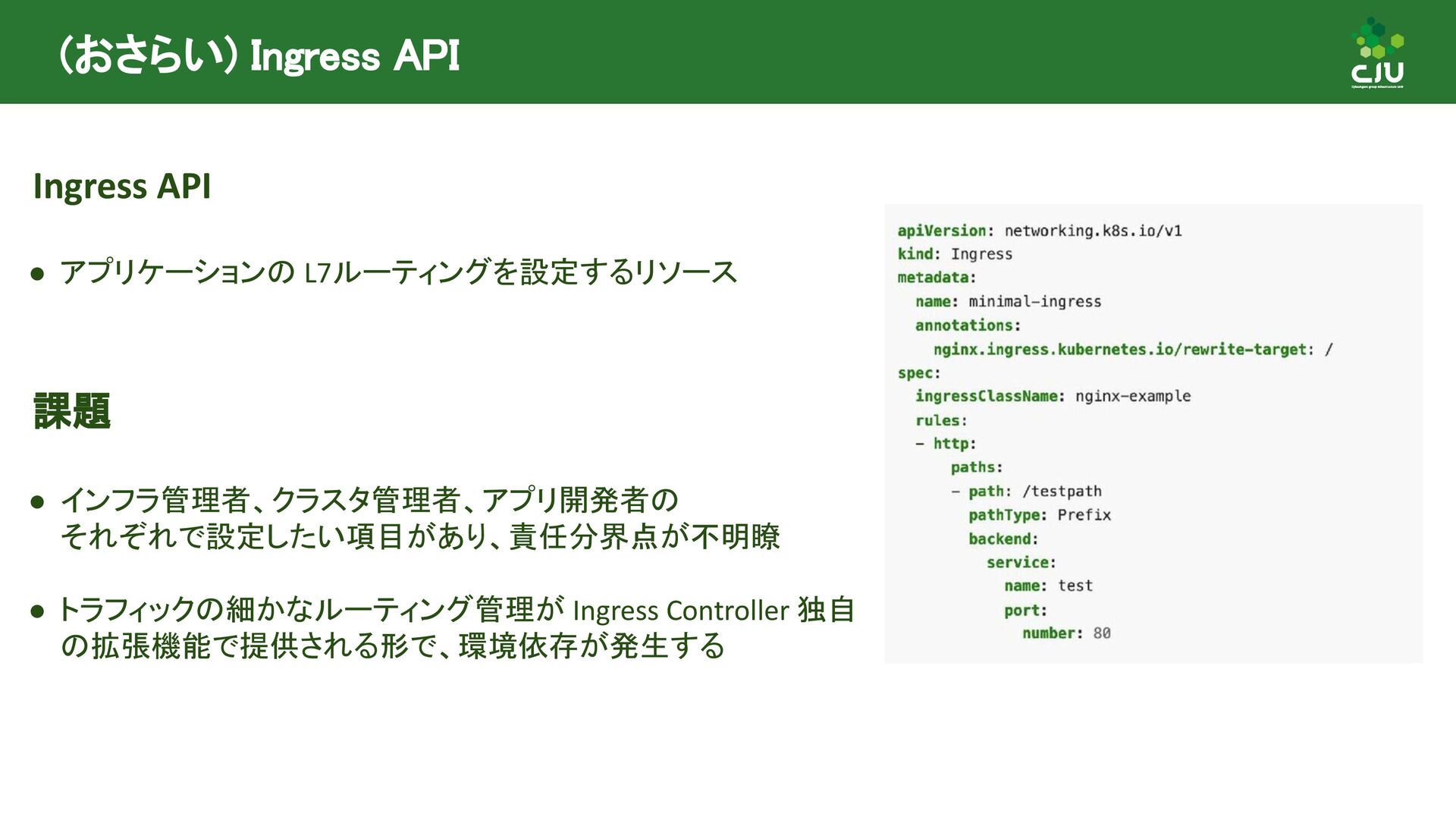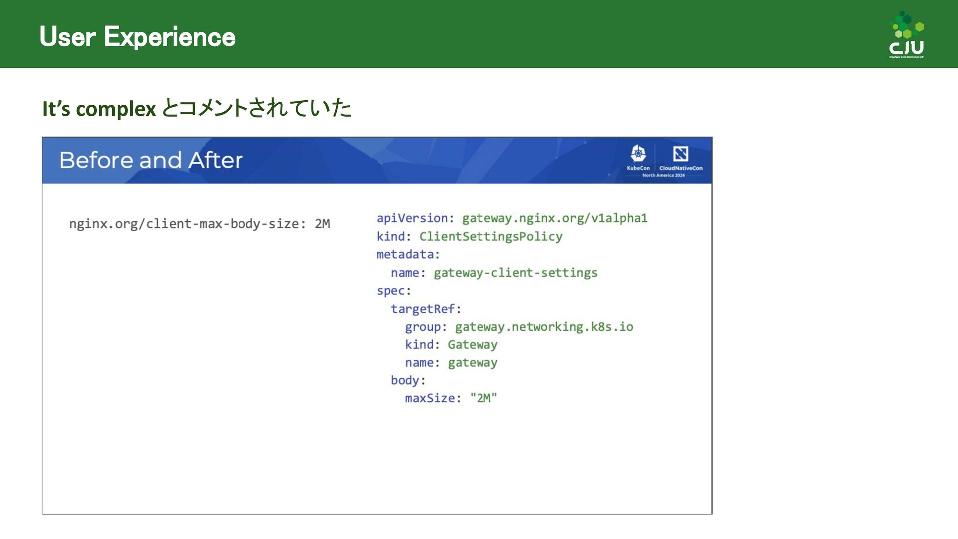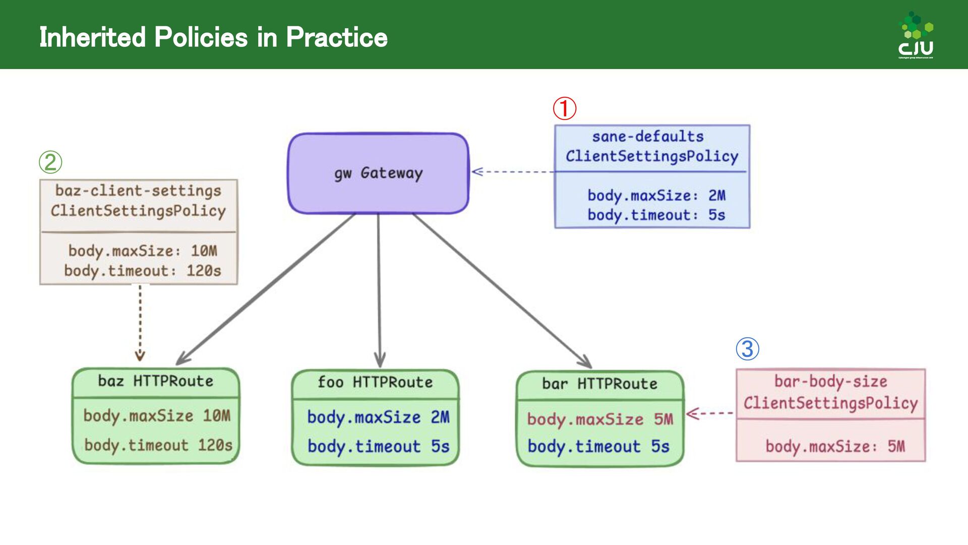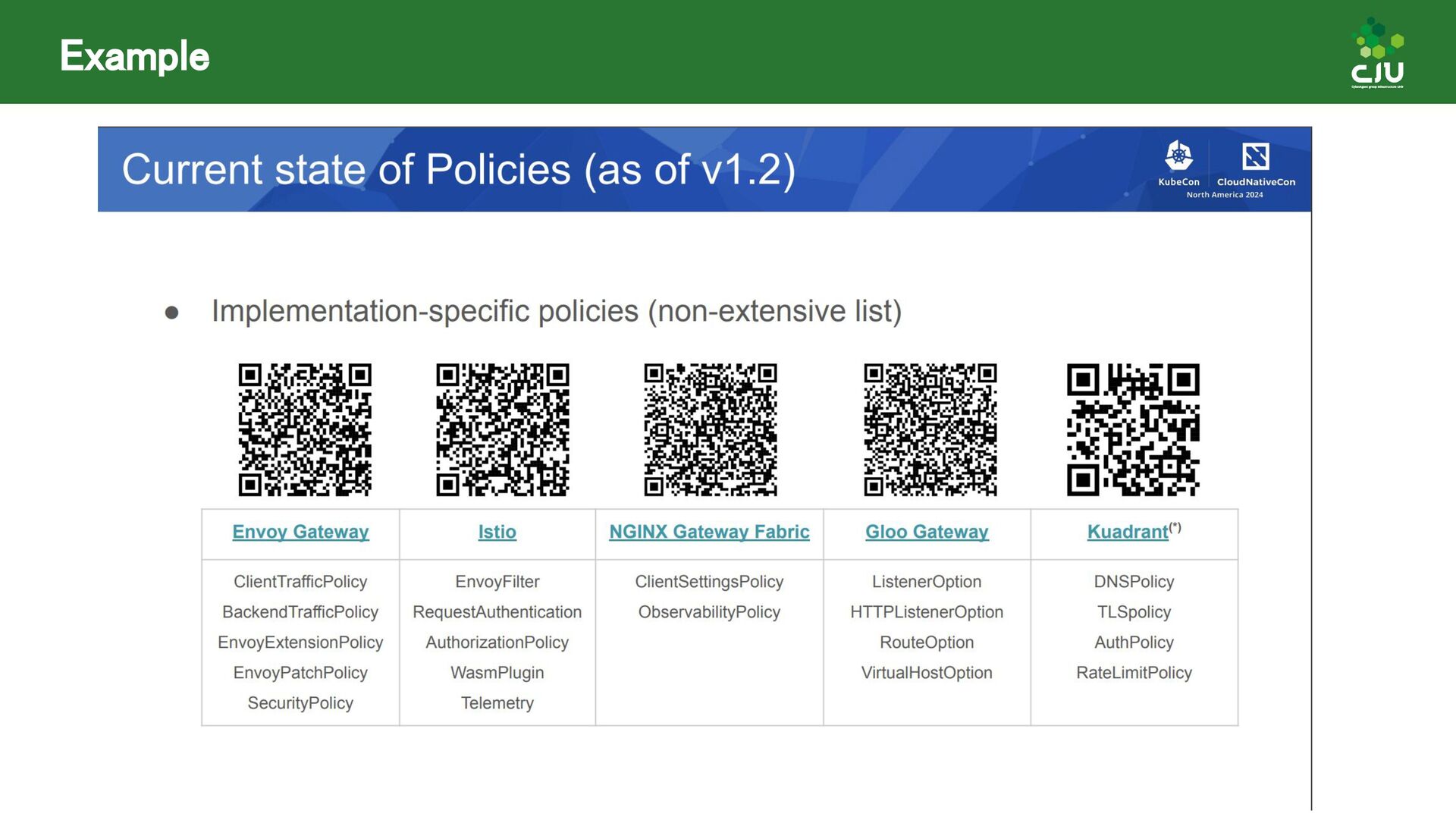 には Direct Policy と Inherited Policiy の2種類が存在 ◦ (所感) Inherited Policy の仕組みは面白いが、やや複雑 • Policy Attachment は現在進行形で Resource 構造や Status の課題など ディスカッションされており、破壊的な変更が入る可能性あり • Policy Attachment の仕組みは今後も発展していきそう ◦ Gateway v1.2 時点で様々な oss が policy を実装している ◦ Gateway v1.3+ 以降で Timeout や Circuit breaking, Auth, CORS など様々な設定を 行うための Policy がリリースできるように Gateway API 公式で議論中