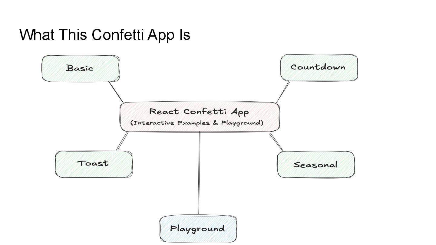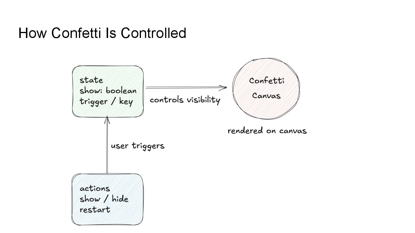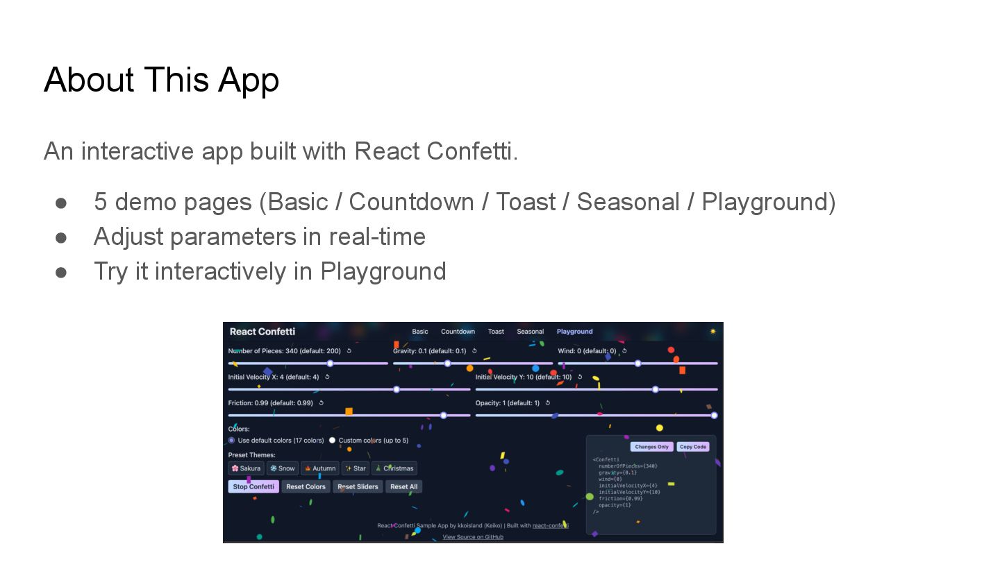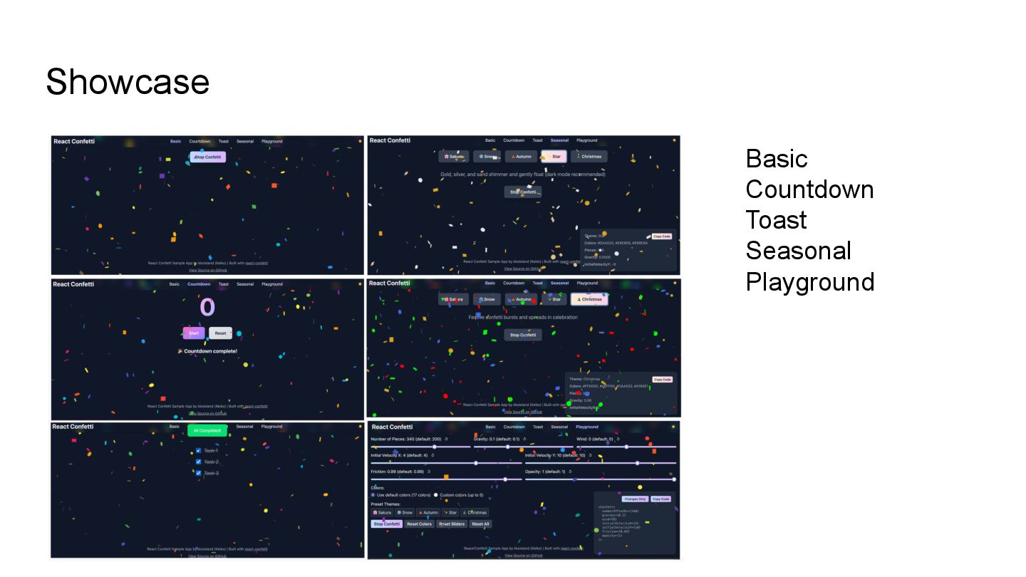 Canvas to react-confetti • Wanted hands-on experience with the library ⚡ Challenges: • Hard to understand behavior visually • No playground to experiment 🎉 Solution: • Built an interactive demo with real-time adjustment • Shared as a resource for exploring react-confetti Built with ❤ for the React community