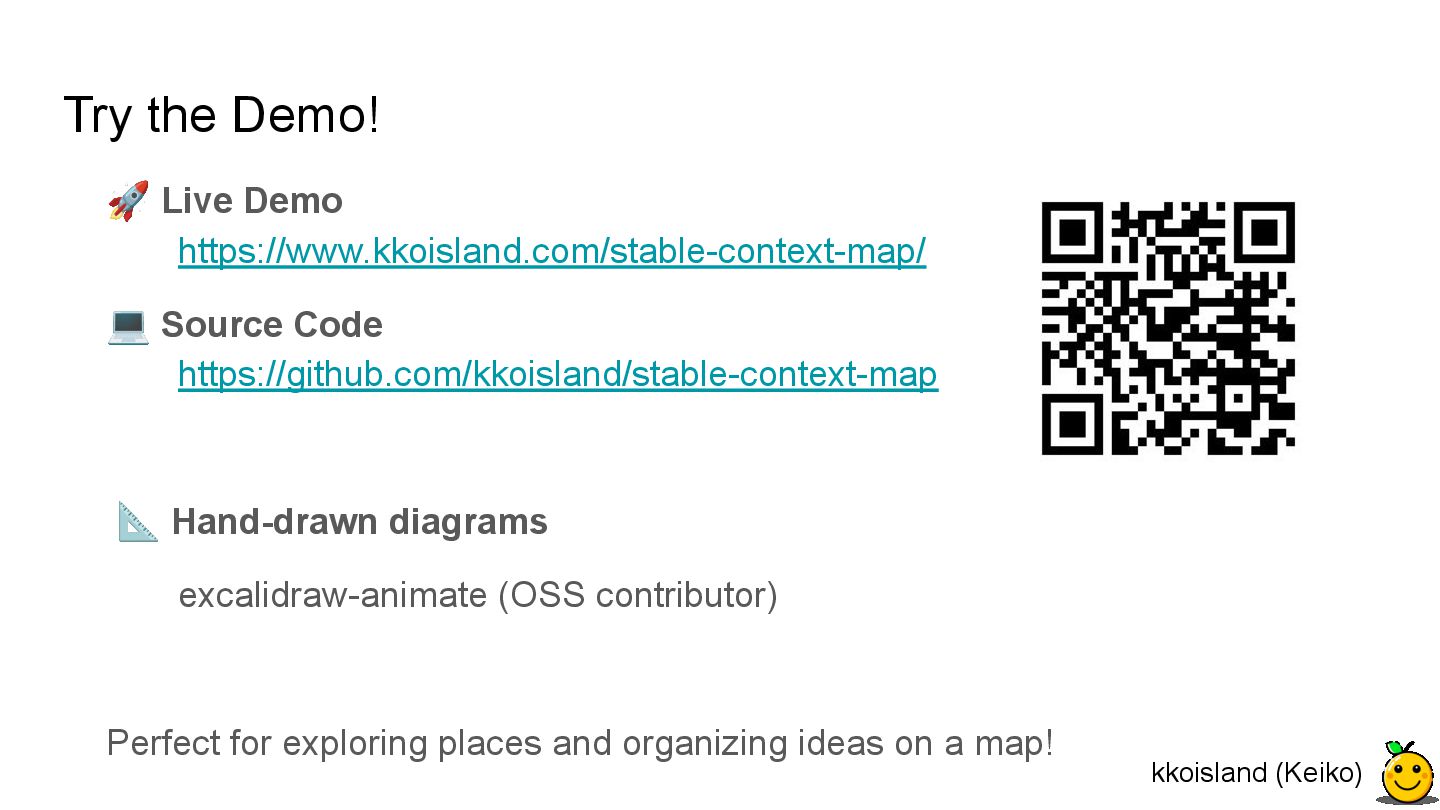 https://github.com/kkoisland/stable-context-map 📐 Hand-drawn diagrams excalidraw-animate (OSS contributor) Perfect for exploring places and organizing ideas on a map! kkoisland (Keiko)