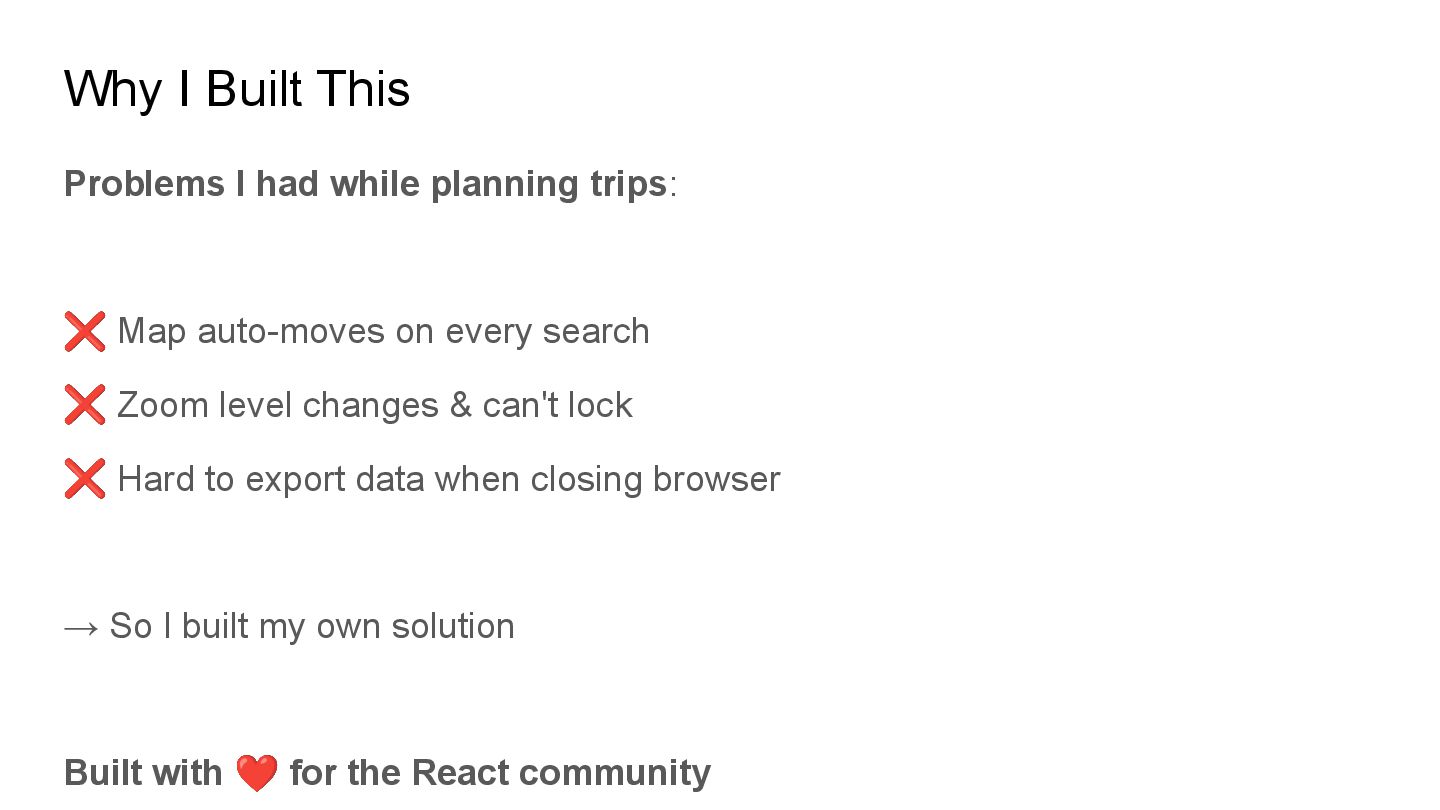 ❌ Map auto-moves on every search ❌ Zoom level changes & can't lock ❌ Hard to export data when closing browser → So I built my own solution Built with ❤ for the React community