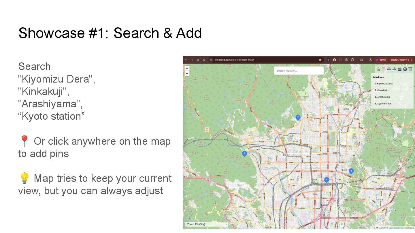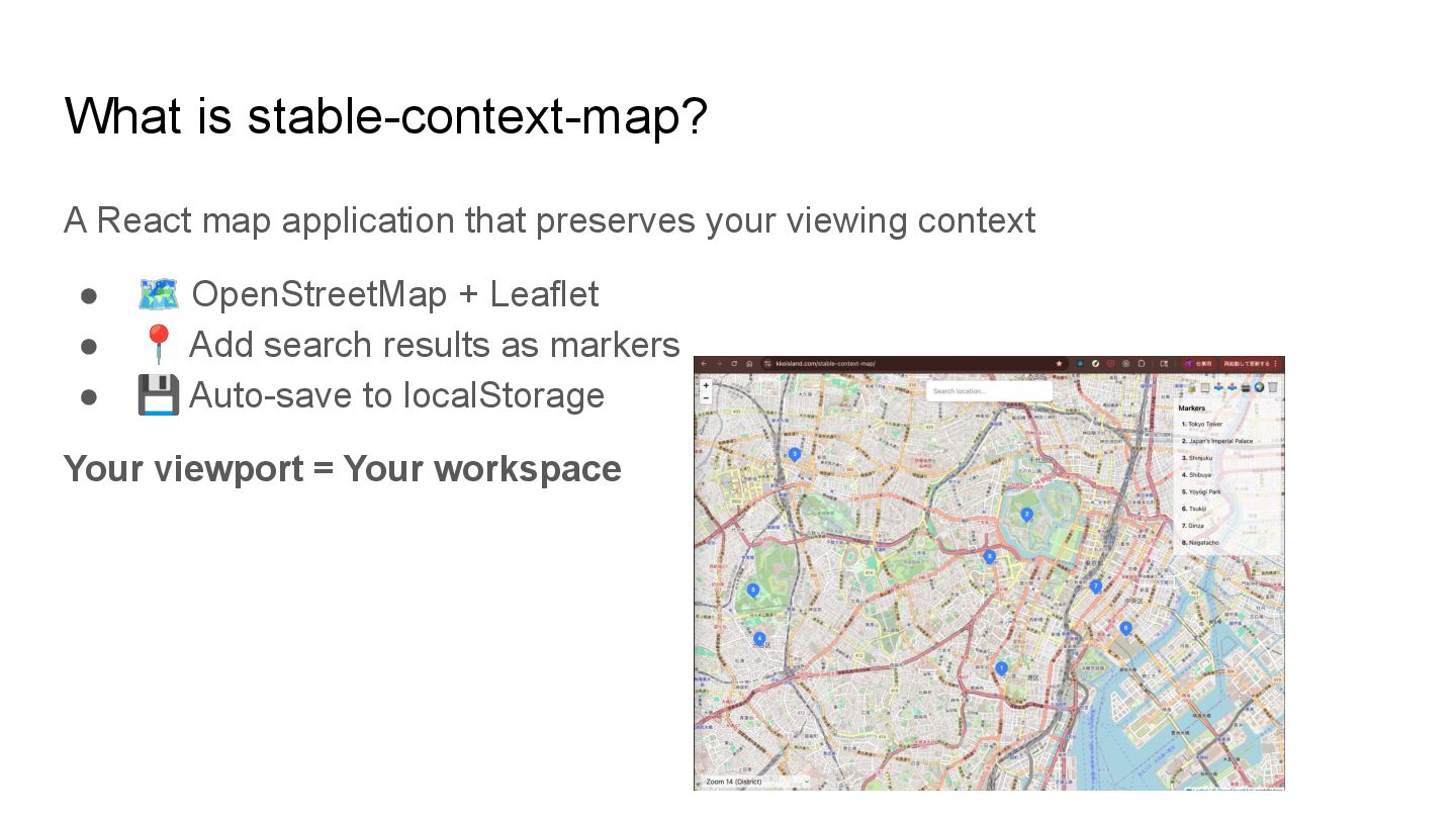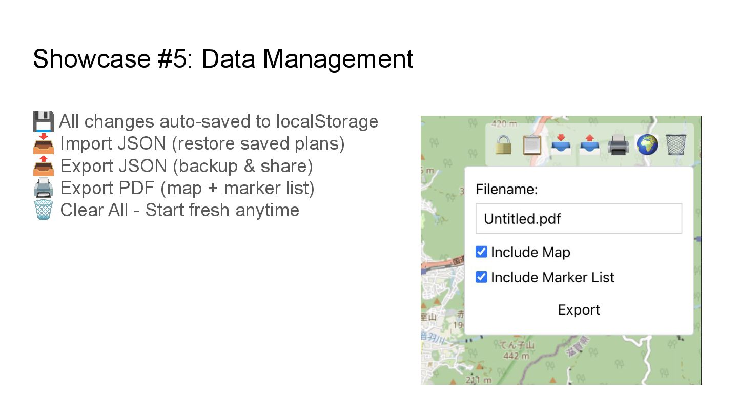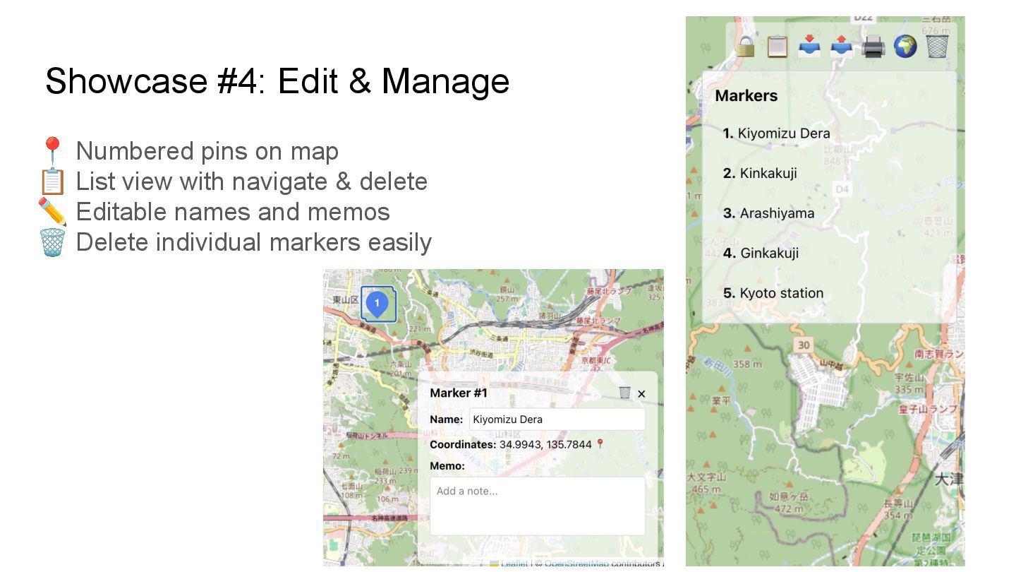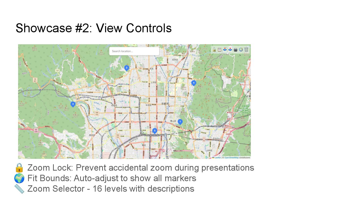 memos for each marker (Marker Info) 📍 Click map to add markers manually 🔒 Zoom lock for presentations 📋 View all markers with navigation and delete (Marker List) 📥 Import from JSON / 📤 Export to JSON 🖨 Export to PDF format 🌍 Fit bounds to show all markers 🗑 Clear all markers & data 📏 Zoom Selector: 16 levels (2–18), lower-left