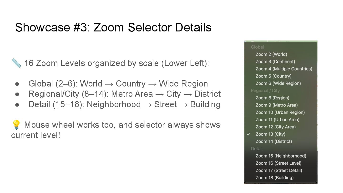 by scale (Lower Left): • Global (2–6): World → Country → Wide Region • Regional/City (8–14): Metro Area → City → District • Detail (15–18): Neighborhood → Street → Building 💡 Mouse wheel works too, and selector always shows current level!
