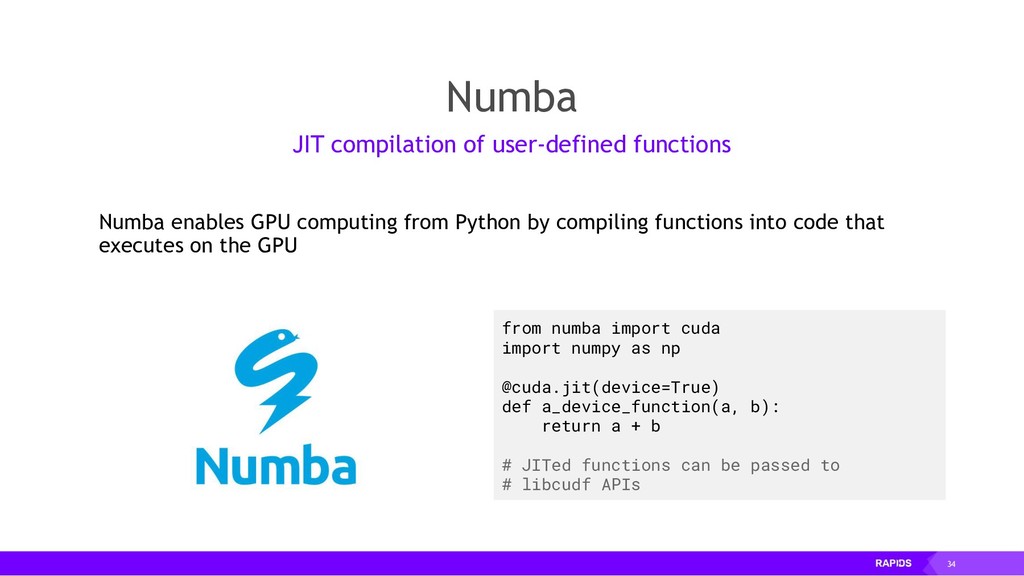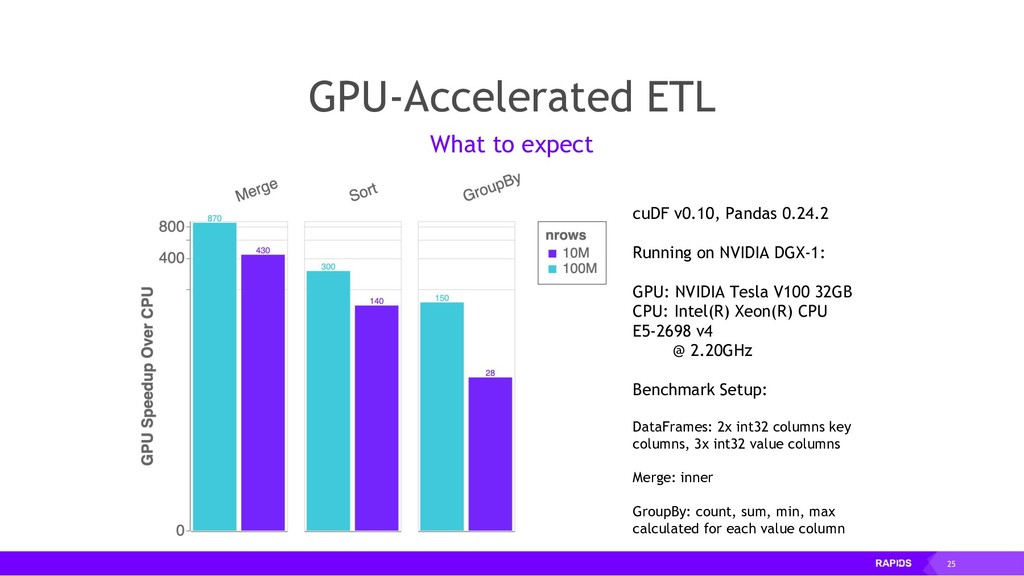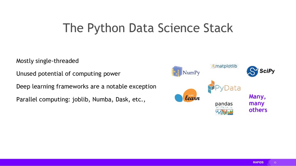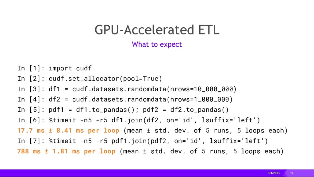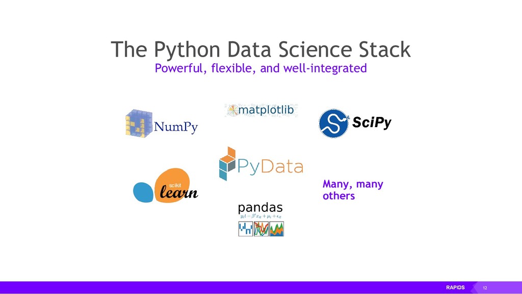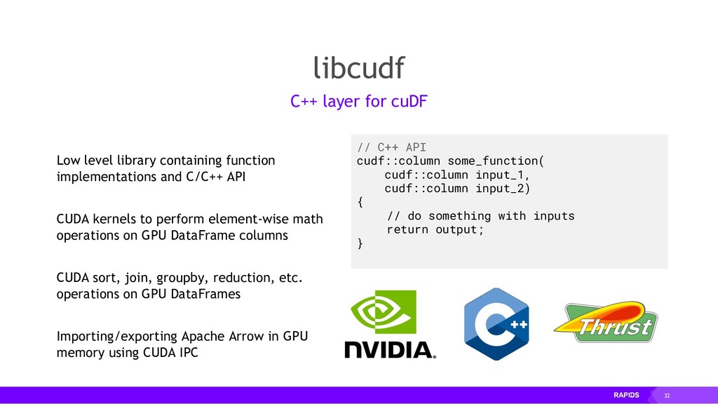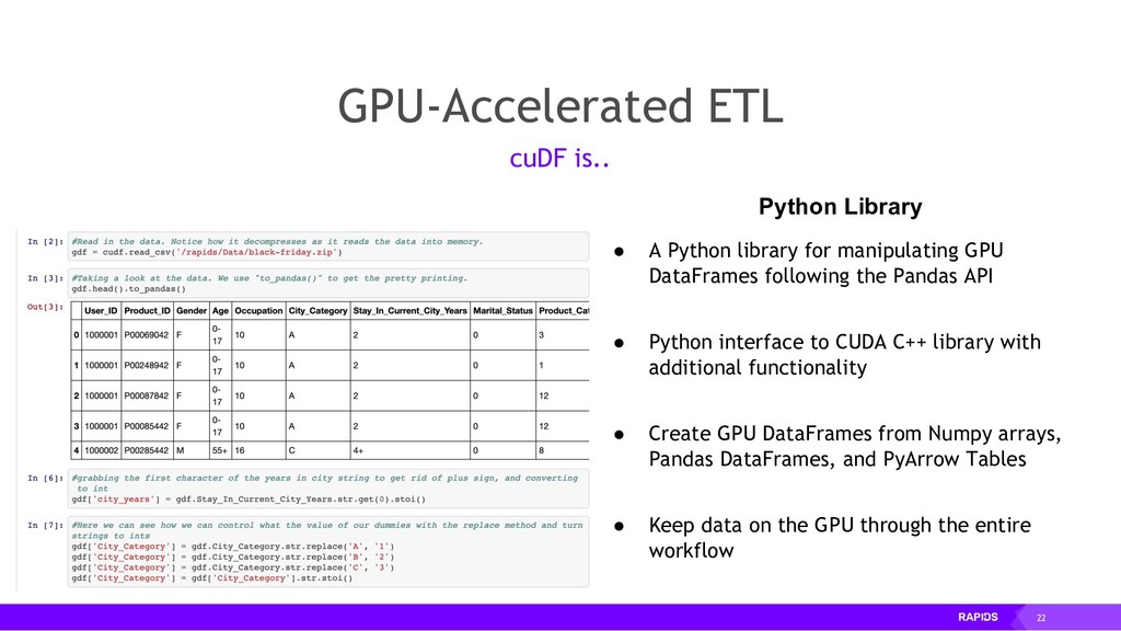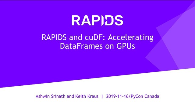 The Python data science stack is composed of a rich set of powerful libraries that work wonderfully well together, providing coherent, beautiful, Pythonic APIs that let the Data Scientist think less about programming and more about the data. However, many of these libraries are largely single_threaded (e.g., Pandas, Scikit-Learn), and as data workflows grow larger, they quickly run up against this limitation. RAPIDS is a suite of open-source libraries that provide APIs nearly identical to existing popular Python libraries. By leveraging the massively parallel processing capabilities of GPUs, RAPIDS libraries can provide speedups of 50x or more over their purely-CPU counterparts. cuDF is a GPU DataFrame library following the Pandas API. cuML is a GPU Machine Learning library following the Scikit-Learn API. cuGraph is a GPU Graph Analytics library with an API inspired by NetworkX. This talk will provide an overview of the RAPIDS ecosystem, with a focus on the cuDF library, its features and design. We'll show how cuDF combines the use of Numba, Cython, modern C++, CUDA, and Apache Arrow to build a highly performant DataFrame library that is also highly interoperable with other libraries in the PyData ecosystem. We'll show examples of workflows using cuDF both on a single GPU, and across multiple GPUs in conjunction with the Dask library. We'll also share some performance results, best practices, tips, and tricks.