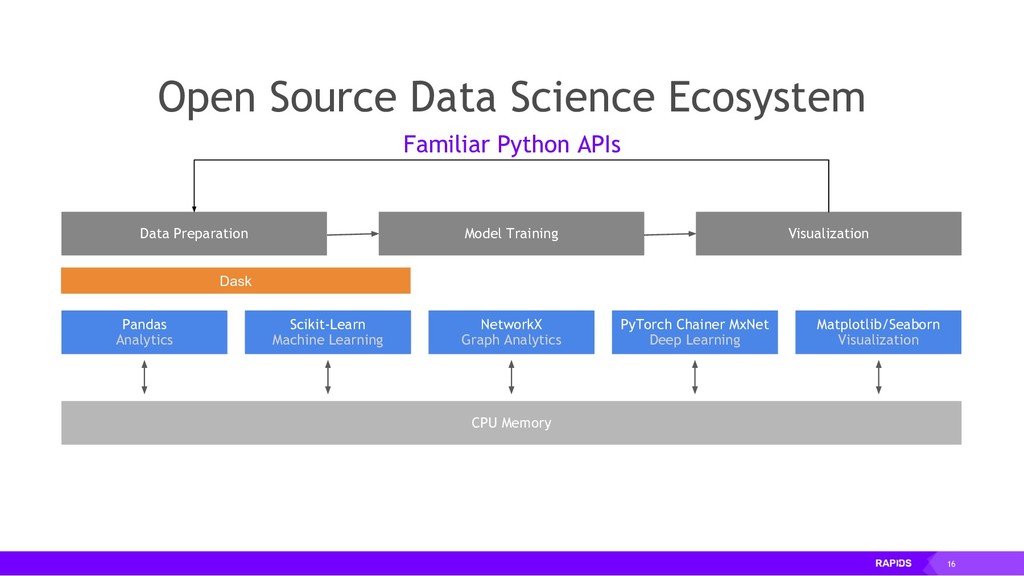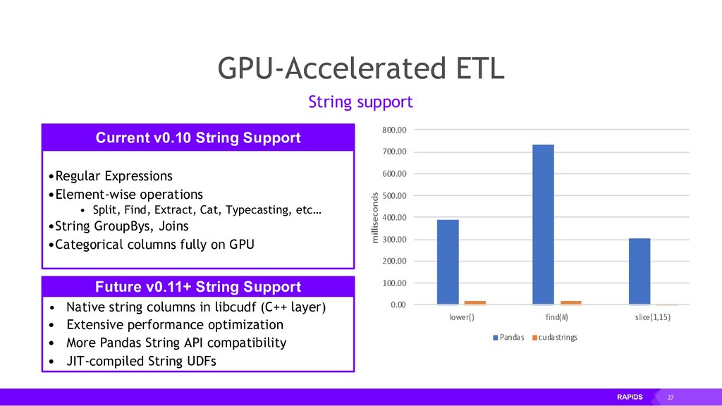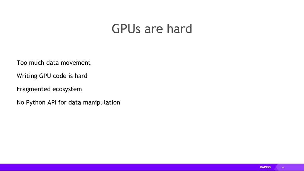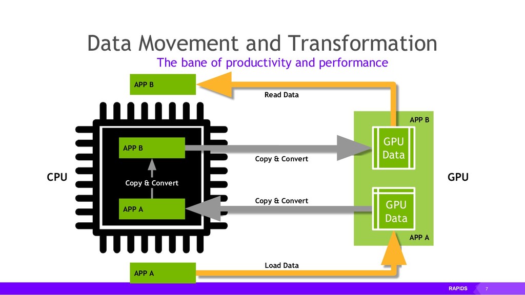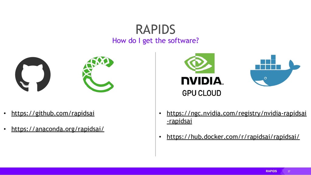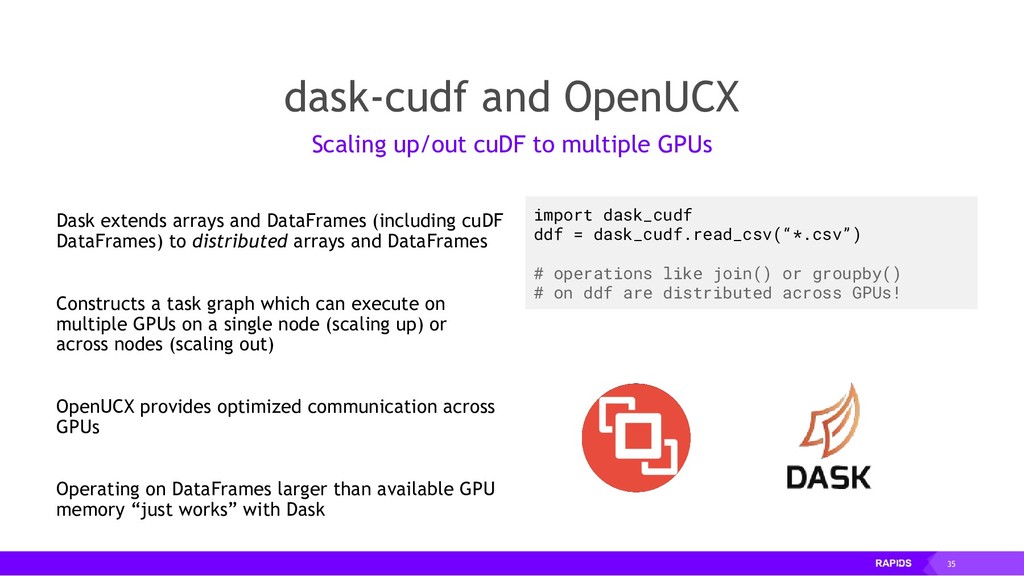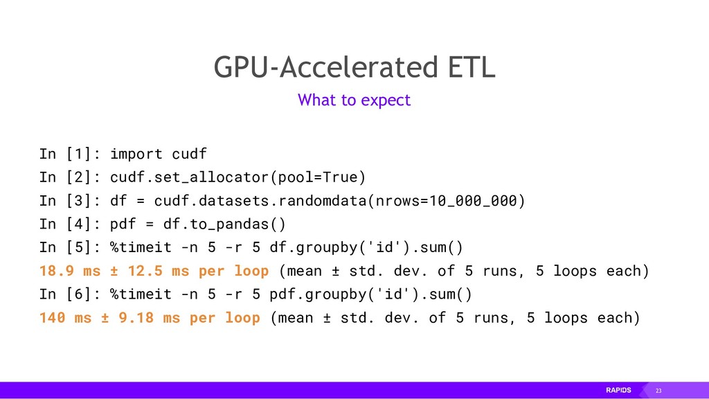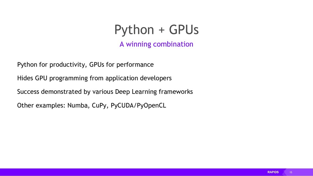 The Python data science stack is composed of a rich set of powerful libraries that work wonderfully well together, providing coherent, beautiful, Pythonic APIs that let the Data Scientist think less about programming and more about the data. However, many of these libraries are largely single_threaded (e.g., Pandas, Scikit-Learn), and as data workflows grow larger, they quickly run up against this limitation. RAPIDS is a suite of open-source libraries that provide APIs nearly identical to existing popular Python libraries. By leveraging the massively parallel processing capabilities of GPUs, RAPIDS libraries can provide speedups of 50x or more over their purely-CPU counterparts. cuDF is a GPU DataFrame library following the Pandas API. cuML is a GPU Machine Learning library following the Scikit-Learn API. cuGraph is a GPU Graph Analytics library with an API inspired by NetworkX. This talk will provide an overview of the RAPIDS ecosystem, with a focus on the cuDF library, its features and design. We'll show how cuDF combines the use of Numba, Cython, modern C++, CUDA, and Apache Arrow to build a highly performant DataFrame library that is also highly interoperable with other libraries in the PyData ecosystem. We'll show examples of workflows using cuDF both on a single GPU, and across multiple GPUs in conjunction with the Dask library. We'll also share some performance results, best practices, tips, and tricks.