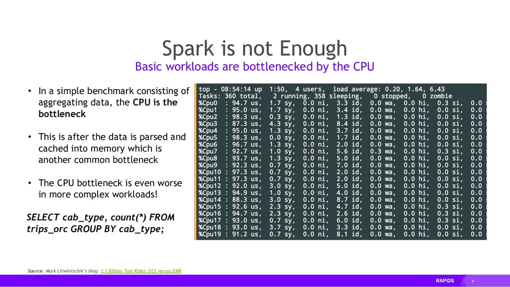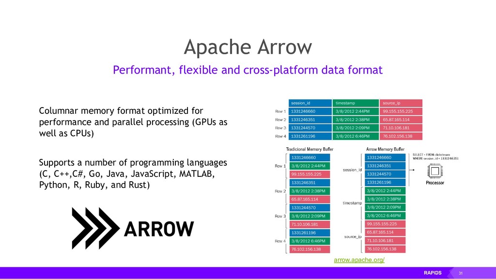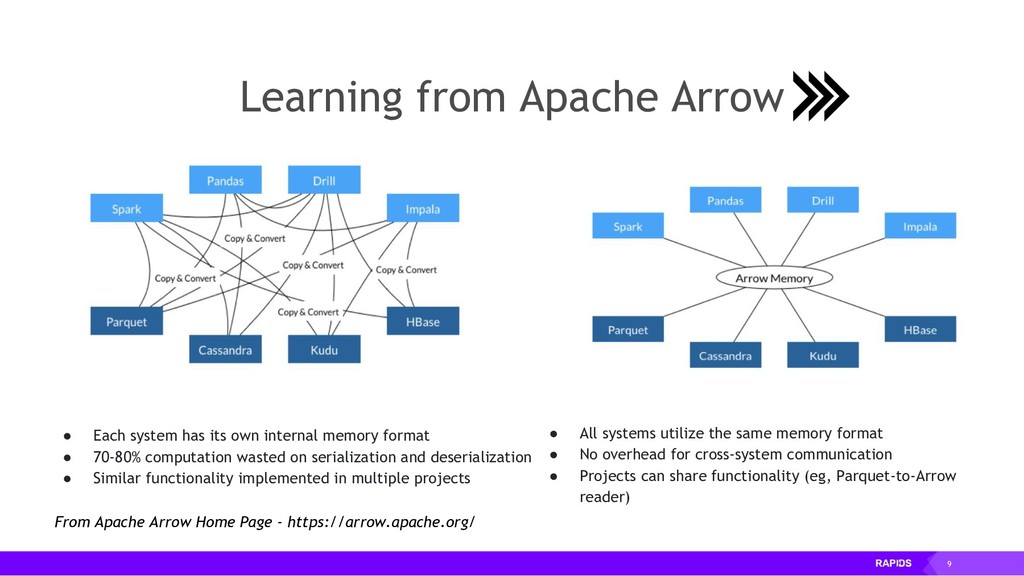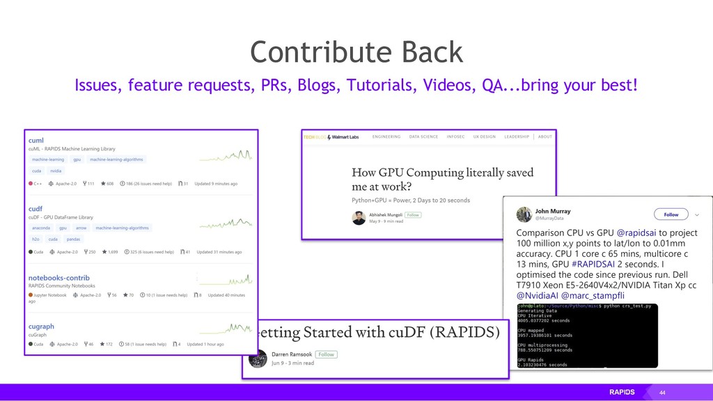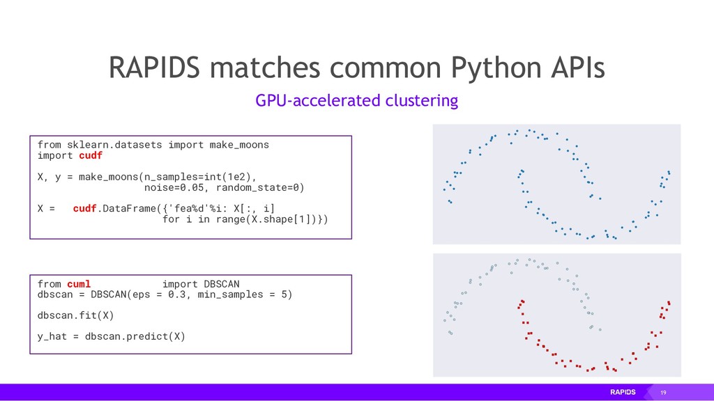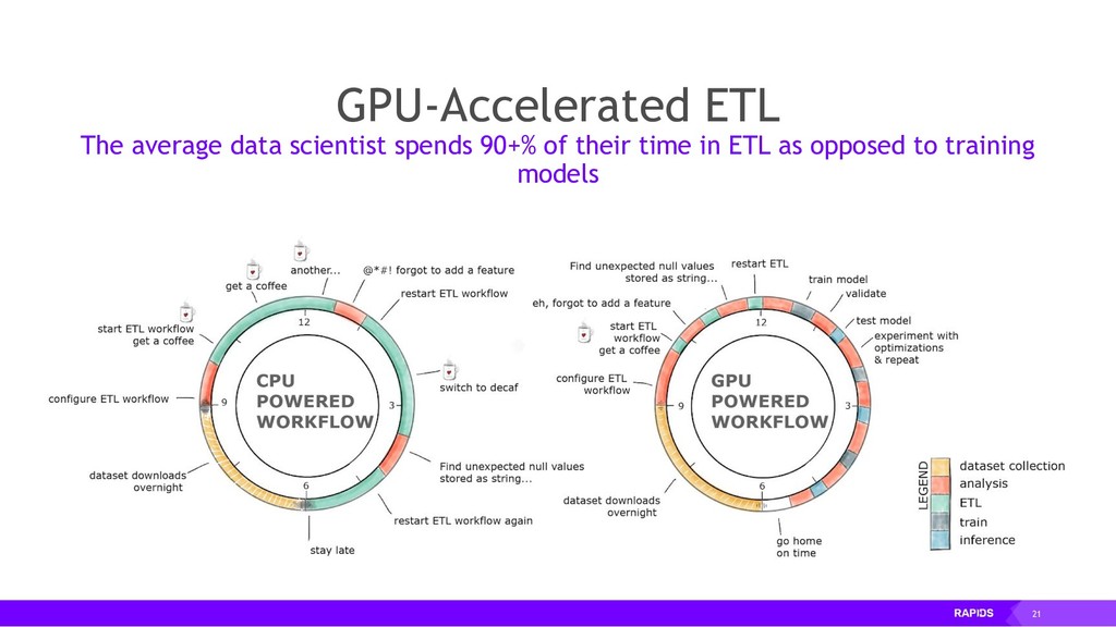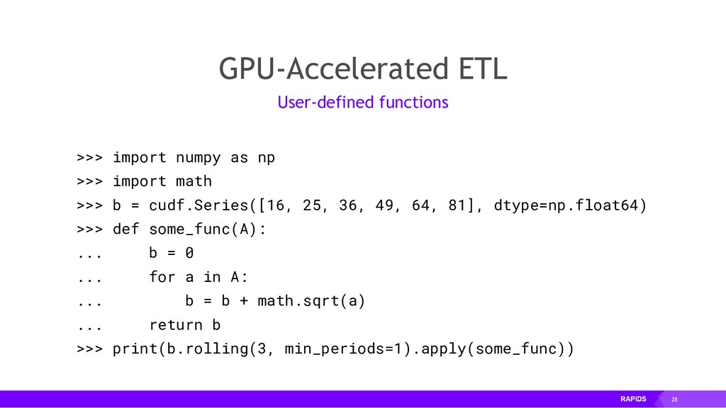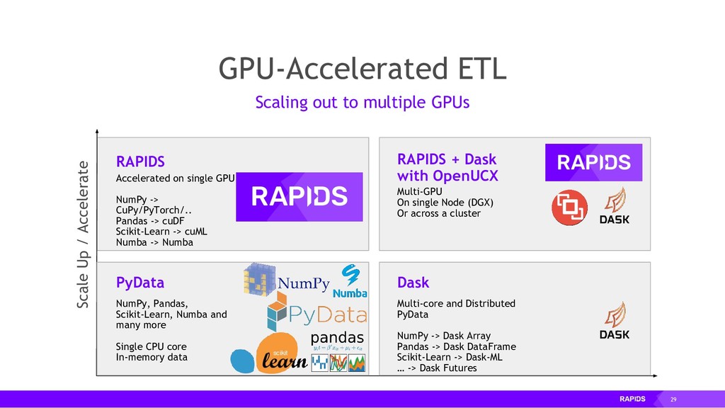 The Python data science stack is composed of a rich set of powerful libraries that work wonderfully well together, providing coherent, beautiful, Pythonic APIs that let the Data Scientist think less about programming and more about the data. However, many of these libraries are largely single_threaded (e.g., Pandas, Scikit-Learn), and as data workflows grow larger, they quickly run up against this limitation. RAPIDS is a suite of open-source libraries that provide APIs nearly identical to existing popular Python libraries. By leveraging the massively parallel processing capabilities of GPUs, RAPIDS libraries can provide speedups of 50x or more over their purely-CPU counterparts. cuDF is a GPU DataFrame library following the Pandas API. cuML is a GPU Machine Learning library following the Scikit-Learn API. cuGraph is a GPU Graph Analytics library with an API inspired by NetworkX. This talk will provide an overview of the RAPIDS ecosystem, with a focus on the cuDF library, its features and design. We'll show how cuDF combines the use of Numba, Cython, modern C++, CUDA, and Apache Arrow to build a highly performant DataFrame library that is also highly interoperable with other libraries in the PyData ecosystem. We'll show examples of workflows using cuDF both on a single GPU, and across multiple GPUs in conjunction with the Dask library. We'll also share some performance results, best practices, tips, and tricks.