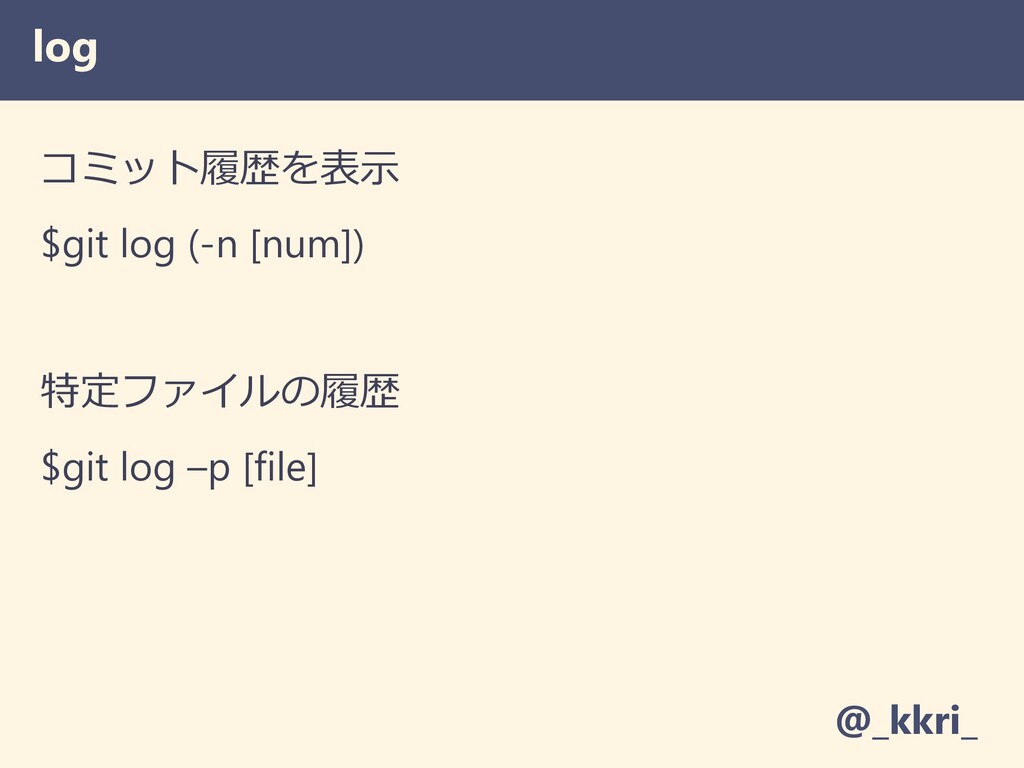@_kkri_ log コミット履歴を表示 $git log (-n [num]) 特定ファイルの履歴 $git log