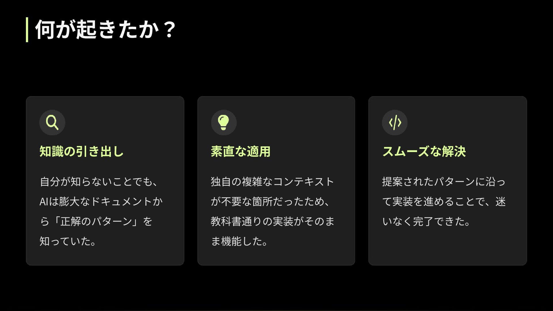 何が起きたか? 知識の引き出し ⾃分が知らないことでも、 AIは膨⼤なドキュメントか ら「正解のパターン」を 知っていた。 素直な適⽤ 独⾃の複雑なコンテキスト が不要な箇所だったため、 教科書通りの実装がそのま