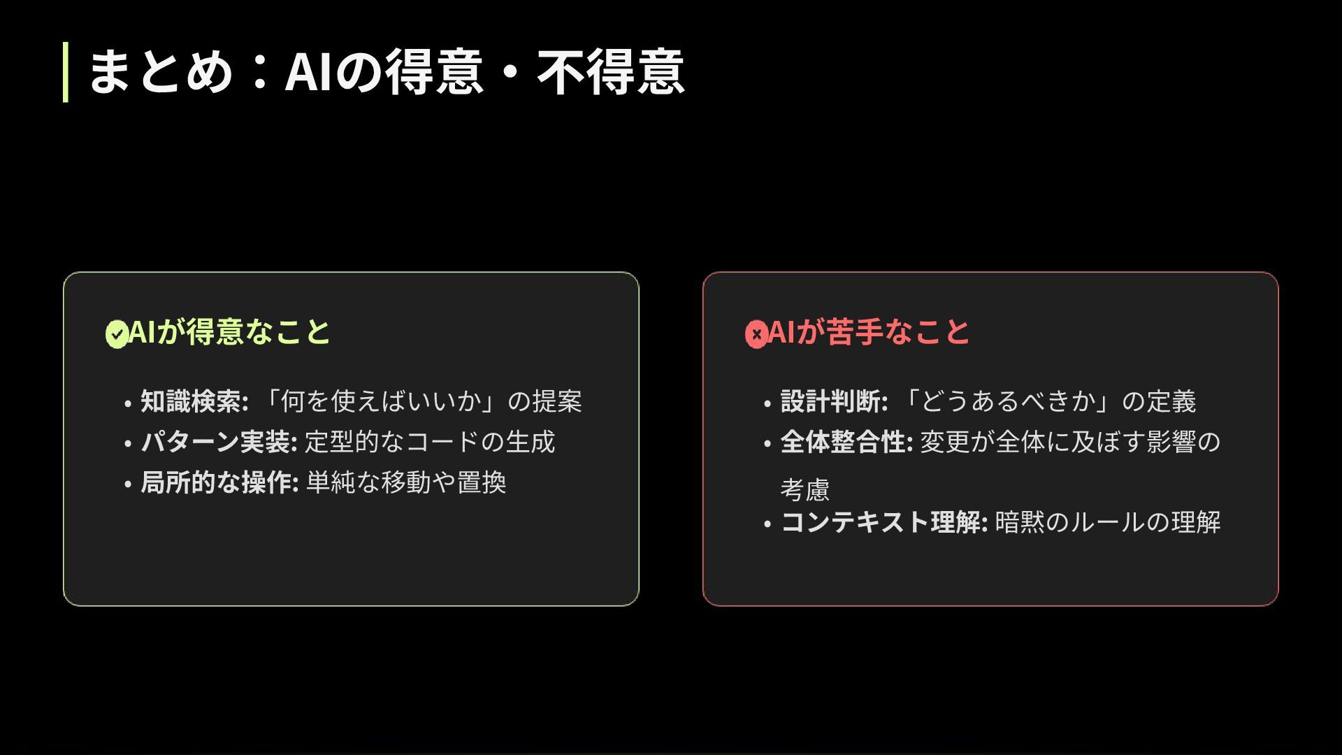 まとめ:AIの得意‧不得意 AIが得意なこと AIが苦⼿なこと • 知識検索: 「何を使えばいいか」の提案 • パターン実装: 定型的なコードの⽣成 •