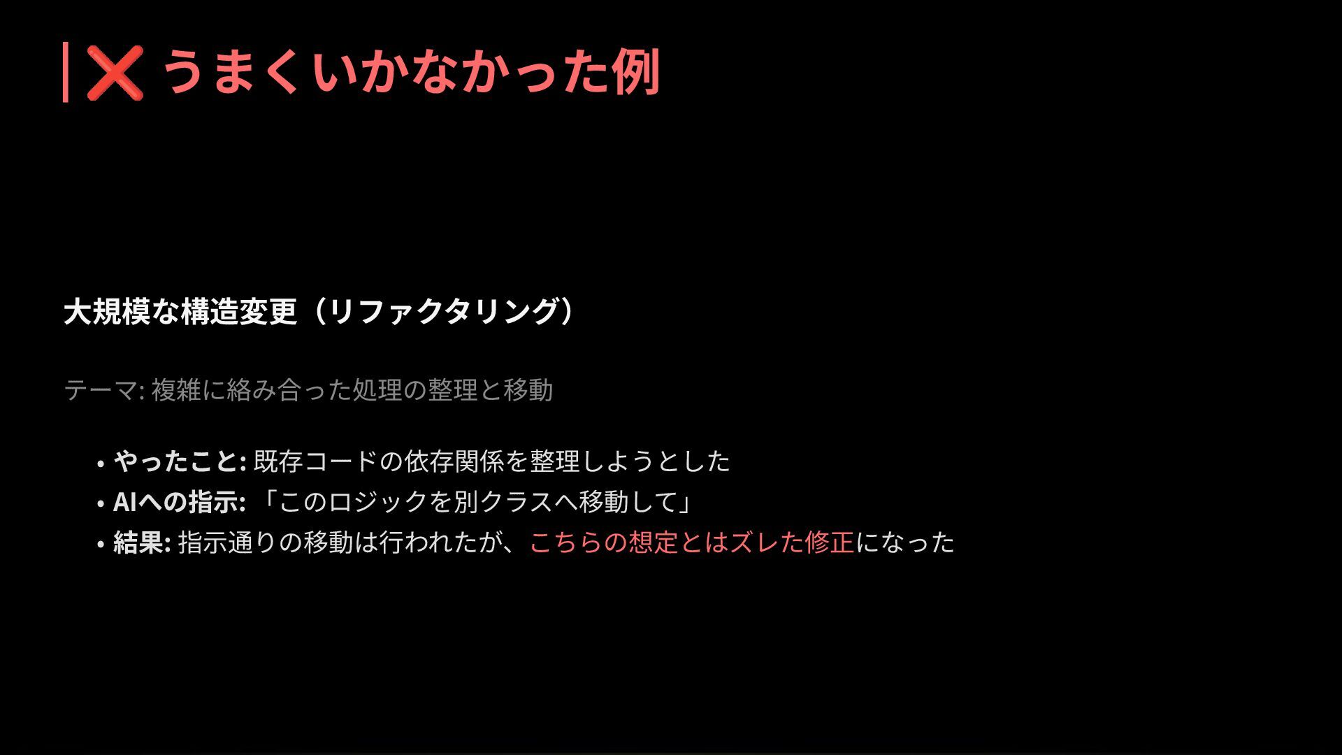❌ うまくいかなかった例 ⼤規模な構造変更(リファクタリング) テーマ: 複雑に絡み合った処理の整理と移動 • やったこと: 既存コードの依存関係を整理しようとした • AIへの指⽰: