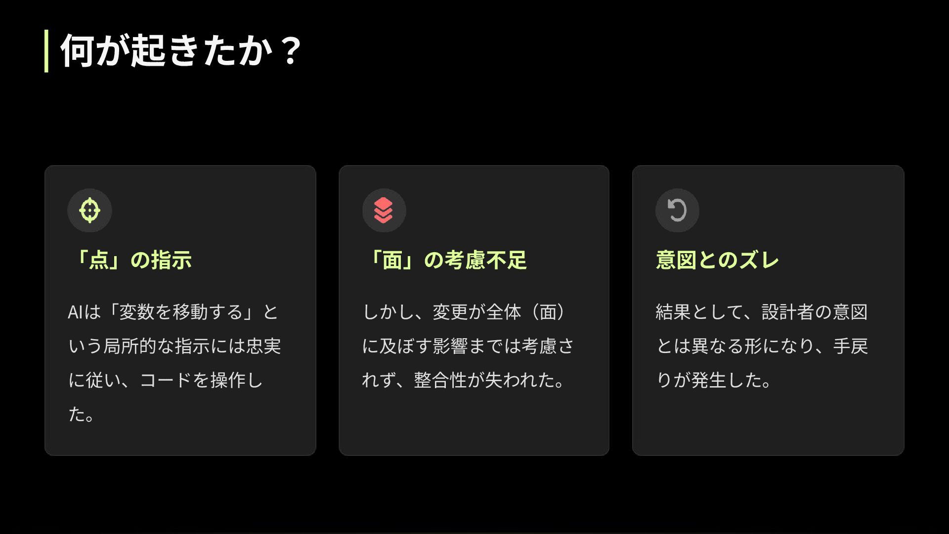 何が起きたか? 「点」の指⽰ AIは「変数を移動する」と いう局所的な指⽰には忠実 に従い、コードを操作し た。 「⾯」の考慮不⾜ しかし、変更が全体(⾯) に及ぼす影響までは考慮さ れず、整合性が失われた。