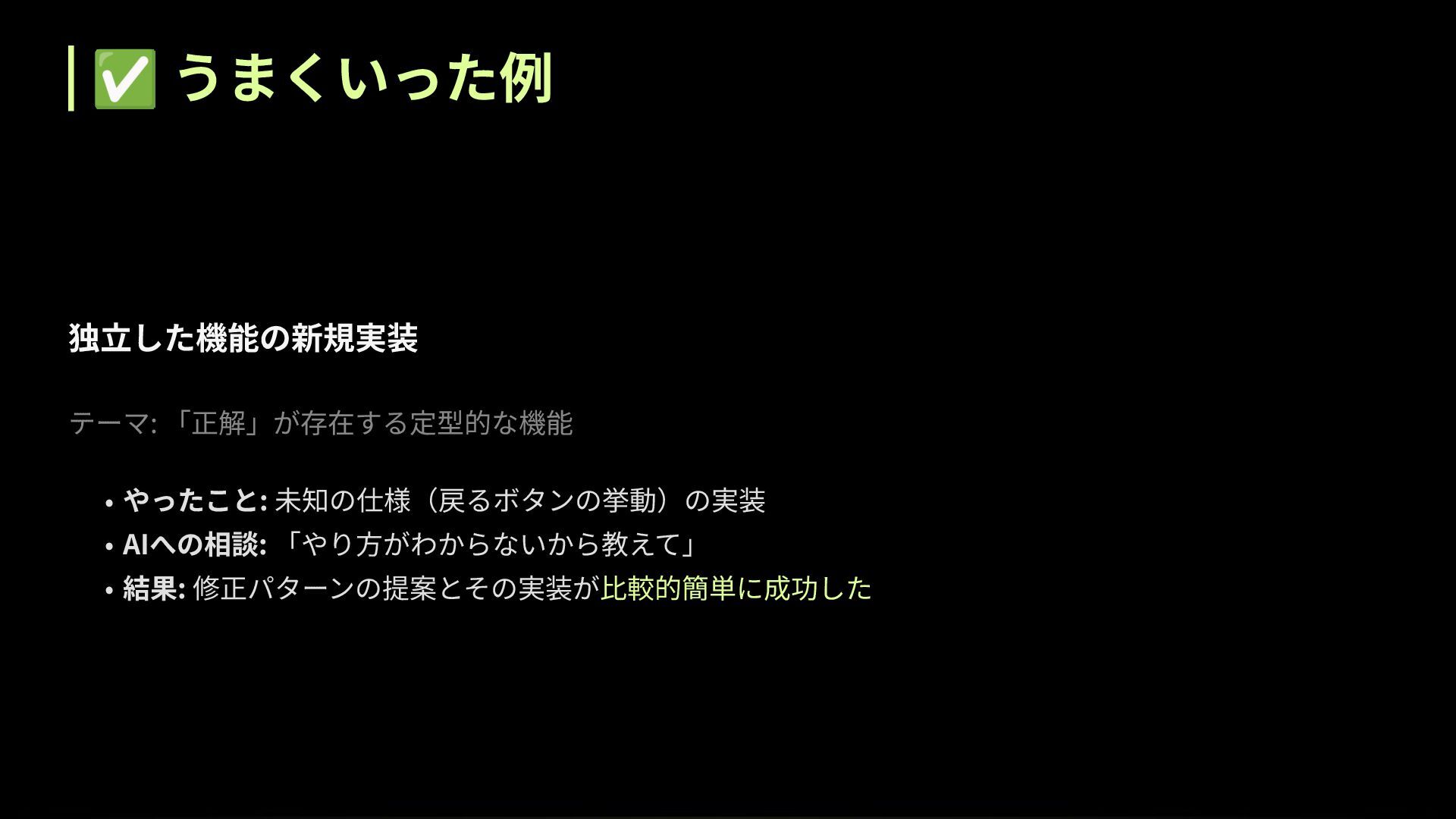 ✅ うまくいった例 独⽴した機能の新規実装 テーマ: 「正解」が存在する定型的な機能 • やったこと: 未知の仕様(戻るボタンの挙動)の実装 • AIへの相談: