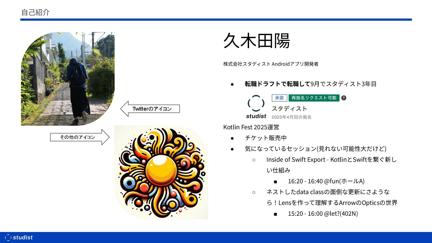 1. ⾃⼰紹介 久⽊⽥陽 株式会社スタディスト Androidアプリ開発者 • 転職ドラフトで転職して9⽉でスタディスト3年⽬ Kotlin Fest 2025運営 •