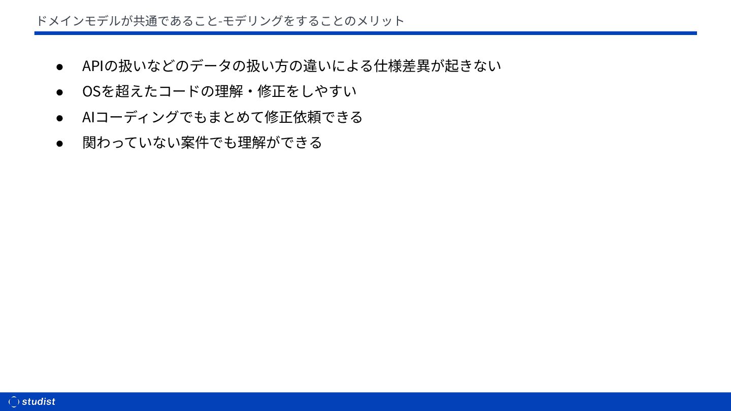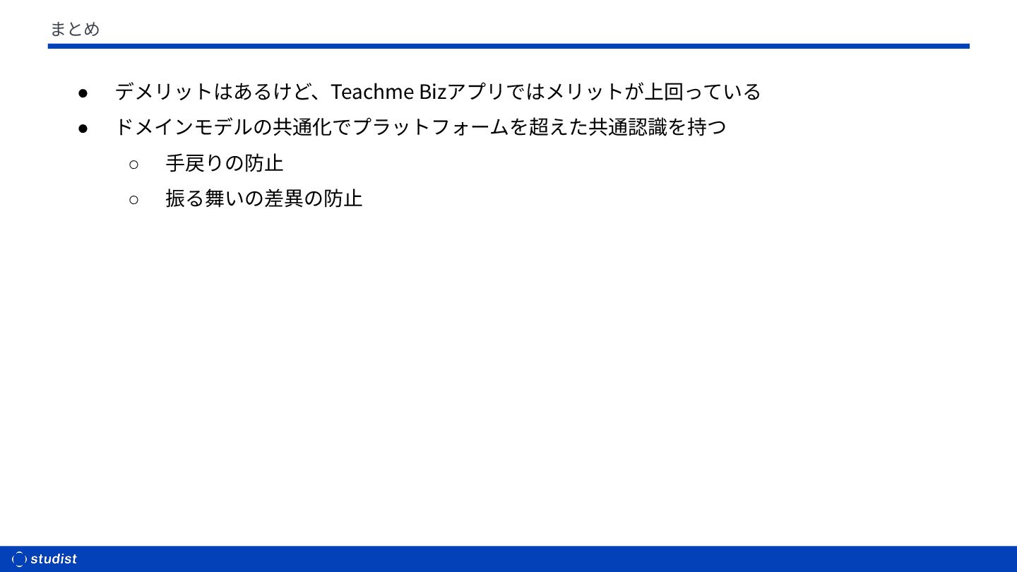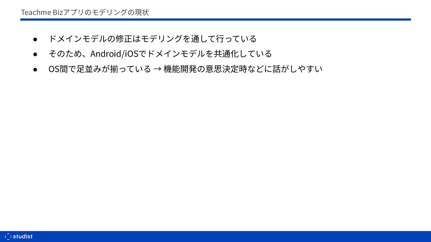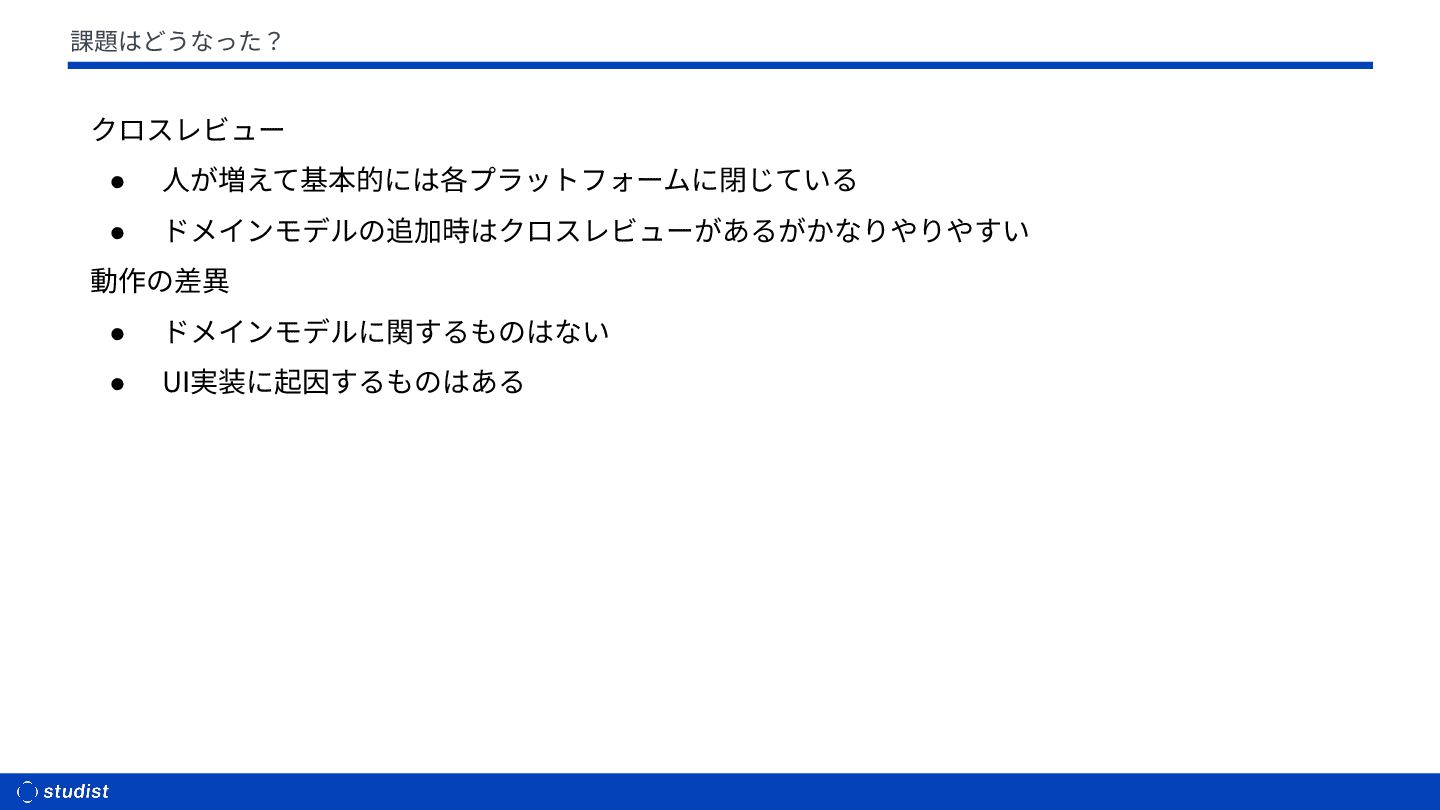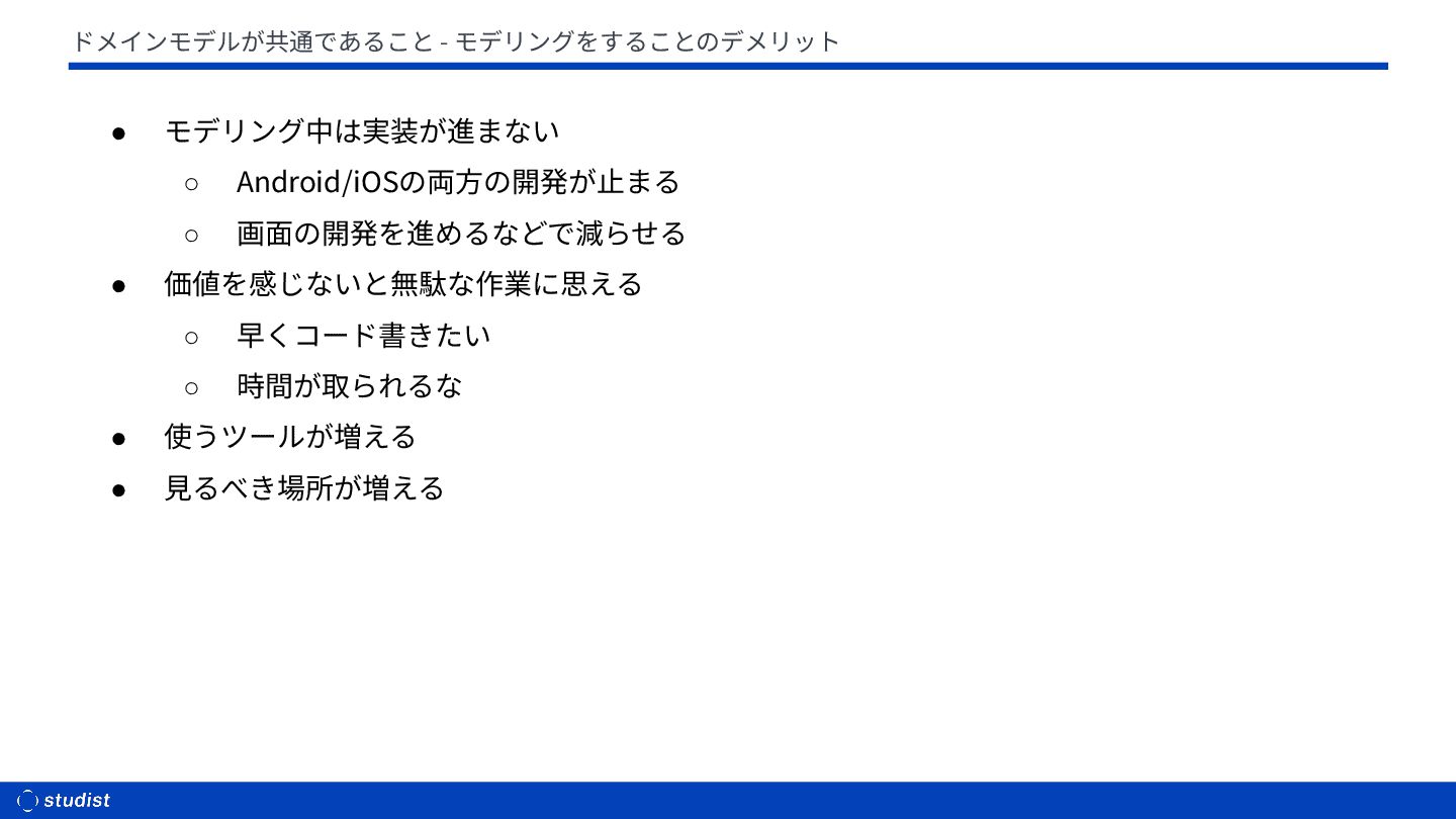 2. ドメインモデルが共通であること - モデリングをすることのデメリット • モデリング中は実装が進まない ◦ Android/iOSの両⽅の開発が⽌まる ◦ 画⾯の開発を進めるなどで減らせる •