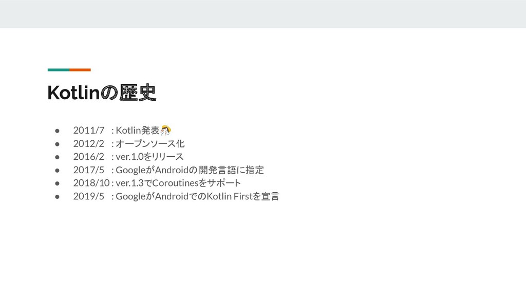 2016/2 : ver.1.0をリリース • 2017/5 : GoogleがAndroidの開発言語に指定 • 2018/10 : ver.1.3でCoroutinesをサポート • 2019/5 : GoogleがAndroidでのKotlin Firstを宣言