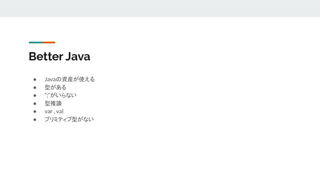 Better Java • Javaの資産が使える • 型がある • “;”がいらない • 型推論