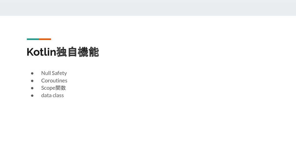 Kotlin独自機能 • Null Safety • Coroutines • Scope関数 • data